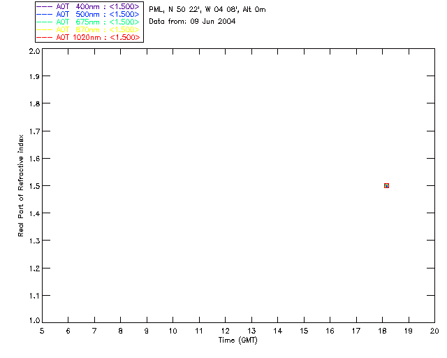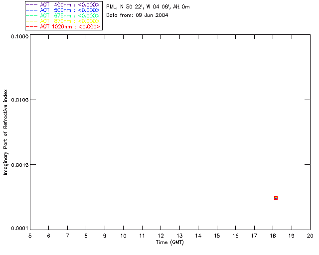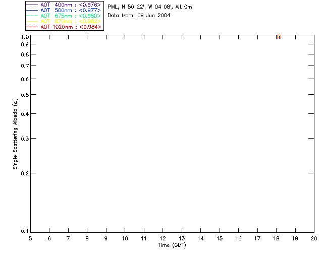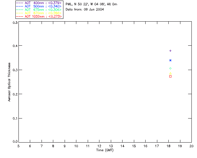 In May 2001 a PREDE POM01-L was installed on the roof of the Plymouth Marine Laboratory to continue the atmospheric correction research of the PML Remote Sensing Group. This was to replace the AERONET CIMEL sunphotometer situated at Rame Head which was decommissioned in 1999. The instrument operates at 7 wavelengths (315, 400, 500, 670, 870, 940 and 1020nm) and scans at pre-set angles away from the solar disk to determine, using the inversion code of Nakajima et al. (2006), various properties of tiny particles called aerosols within the atmospheric column. From these measurements useful atmospheric aerosol parameters such as the Aerosol Optical Thickness (AOT), aerosol size distribution and single scattering albedo can be calculated. Marine aerosols tend to be bigger (D > 1µm) than those generated over the land (0.01 < D < 1µm) and are of a different chemical composition; marine aerosols are salt particles whereas terrestrial aerosols are sulphate compounds.