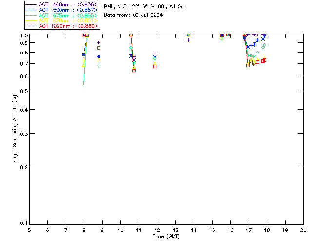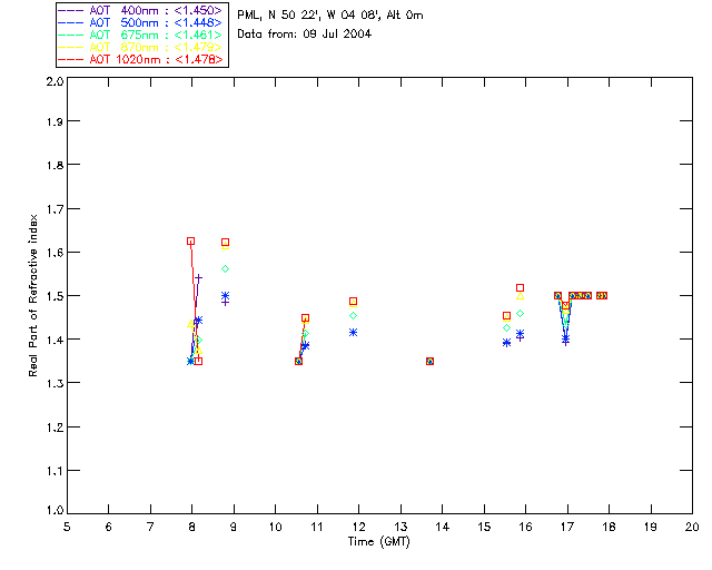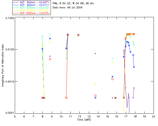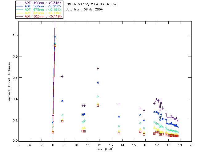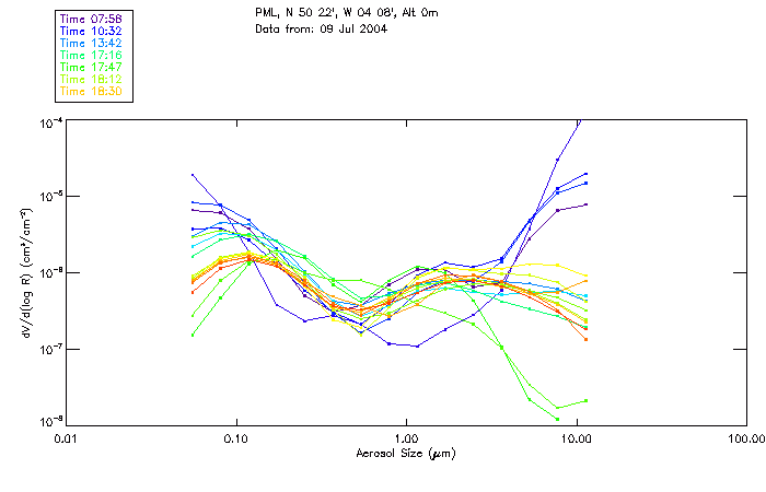In May 2001 a PREDE POM01-L was installed on the roof of the Plymouth Marine Laboratory to continue the atmospheric correction research of the PML Remote Sensing Group. This was to replace the AERONET CIMEL sunphotometer situated at Rame Head which was decommissioned in 1999. The instrument operates at 7 wavelengths (315, 400, 500, 670, 870, 940 and 1020nm) and scans at pre-set angles away from the solar disk to determine, using the inversion code of Nakajima et al. (2006), various properties of tiny particles called aerosols within the atmospheric column. From these measurements useful atmospheric aerosol parameters such as the Aerosol Optical Thickness (AOT), aerosol size distribution and single scattering albedo can be calculated. Marine aerosols tend to be bigger (D > 1µm) than those generated over the land (0.01 < D < 1µm) and are of a different chemical composition; marine aerosols are salt particles whereas terrestrial aerosols are sulphate compounds.