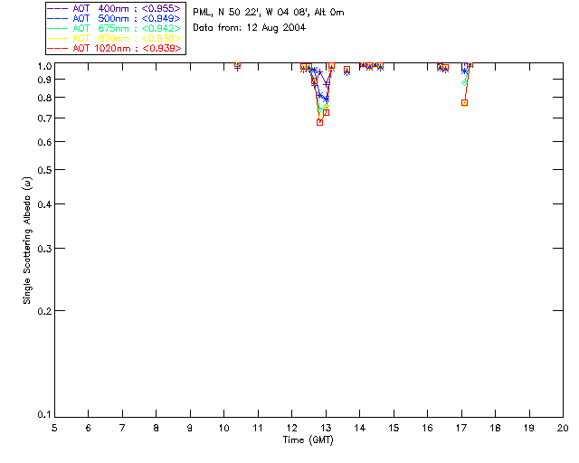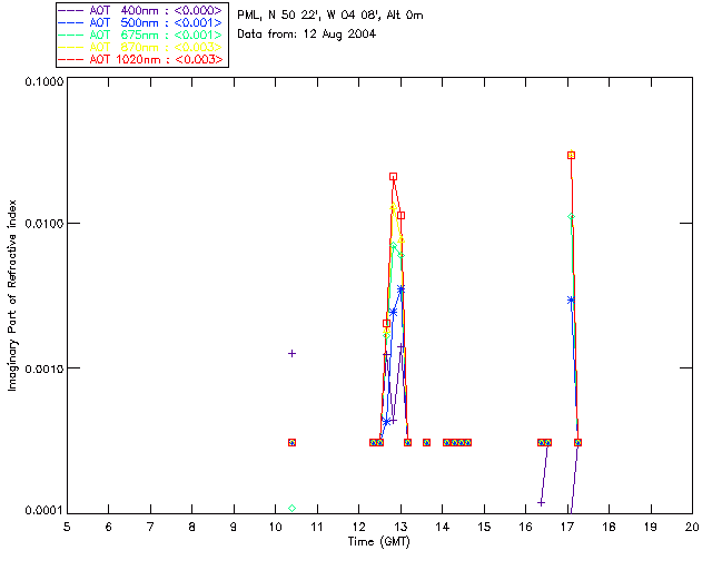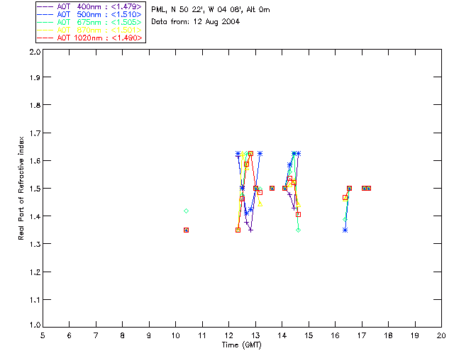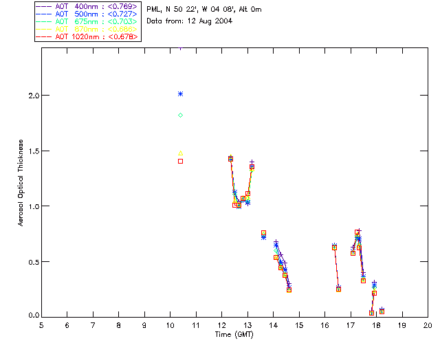 In May 2001 a PREDE POM01-L was installed on the roof of the Plymouth Marine Laboratory to continue the atmospheric correction research of the PML Remote Sensing Group. This was to replace the AERONET CIMEL sunphotometer situated at Rame Head which was decommissioned in 1999. The instrument operates at 7 wavelengths (315, 400, 500, 670, 870, 940 and 1020nm) and scans at pre-set angles away from the solar disk to determine, using the inversion code of Nakajima et al. (2006), various properties of tiny particles called aerosols within the atmospheric column. From these measurements useful atmospheric aerosol parameters such as the Aerosol Optical Thickness (AOT), aerosol size distribution and single scattering albedo can be calculated. Marine aerosols tend to be bigger (D > 1µm) than those generated over the land (0.01 < D < 1µm) and are of a different chemical composition; marine aerosols are salt particles whereas terrestrial aerosols are sulphate compounds.