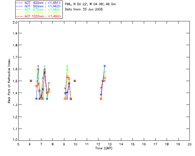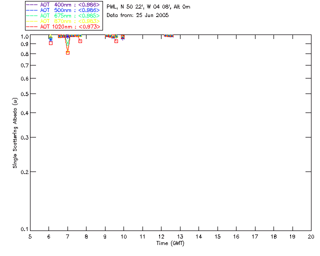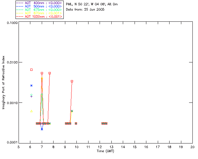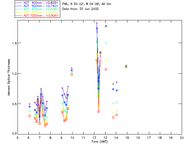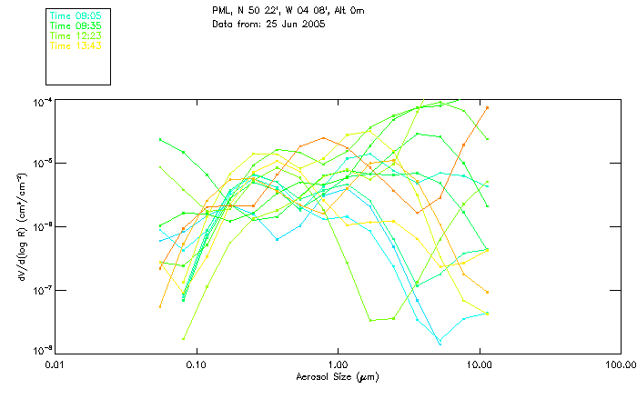 In May 2001 a PREDE POM01-L was installed on the roof of the Plymouth Marine Laboratory to continue the atmospheric correction research of the PML Remote Sensing Group. This was to replace the AERONET CIMEL sunphotometer situated at Rame Head which was decommissioned in 1999. The instrument operates at 7 wavelengths (315, 400, 500, 670, 870, 940 and 1020nm) and scans at pre-set angles away from the solar disk to determine, using the inversion code of Nakajima et al. (2006), various properties of tiny particles called aerosols within the atmospheric column. From these measurements useful atmospheric aerosol parameters such as the Aerosol Optical Thickness (AOT), aerosol size distribution and single scattering albedo can be calculated. Marine aerosols tend to be bigger (D > 1µm) than those generated over the land (0.01 < D < 1µm) and are of a different chemical composition; marine aerosols are salt particles whereas terrestrial aerosols are sulphate compounds.