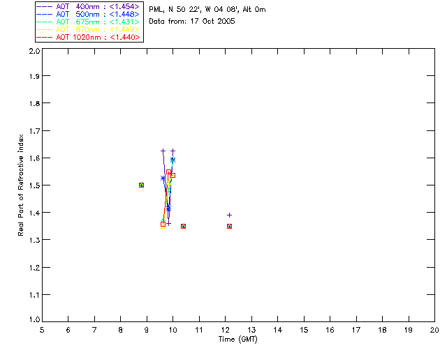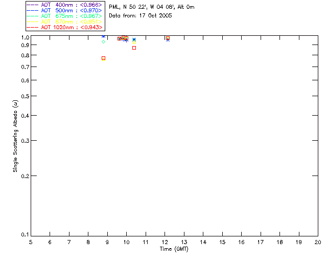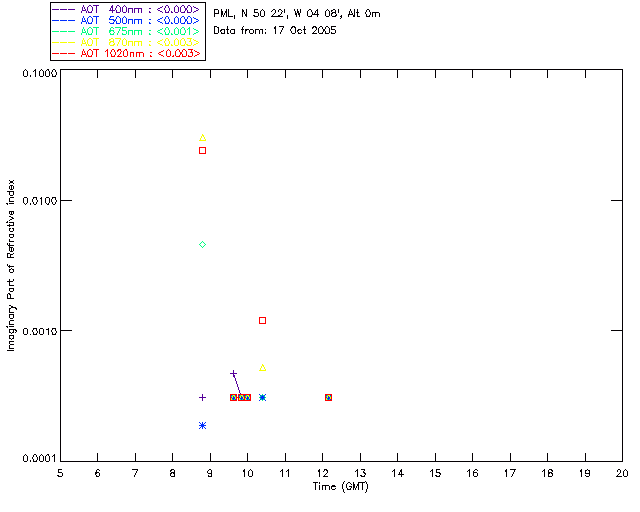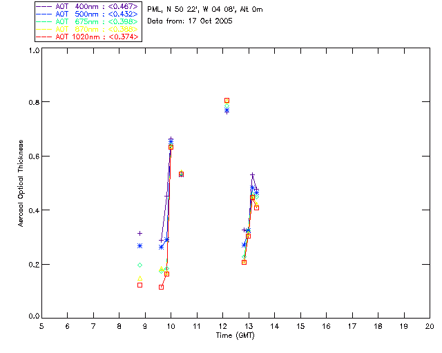 In May 2001 a PREDE POM01-L was installed on the roof of the Plymouth Marine Laboratory to continue the atmospheric correction research of the PML Remote Sensing Group. This was to replace the AERONET CIMEL sunphotometer situated at Rame Head which was decommissioned in 1999. The instrument operates at 7 wavelengths (315, 400, 500, 670, 870, 940 and 1020nm) and scans at pre-set angles away from the solar disk to determine, using the inversion code of Nakajima et al. (2006), various properties of tiny particles called aerosols within the atmospheric column. From these measurements useful atmospheric aerosol parameters such as the Aerosol Optical Thickness (AOT), aerosol size distribution and single scattering albedo can be calculated. Marine aerosols tend to be bigger (D > 1µm) than those generated over the land (0.01 < D < 1µm) and are of a different chemical composition; marine aerosols are salt particles whereas terrestrial aerosols are sulphate compounds.
