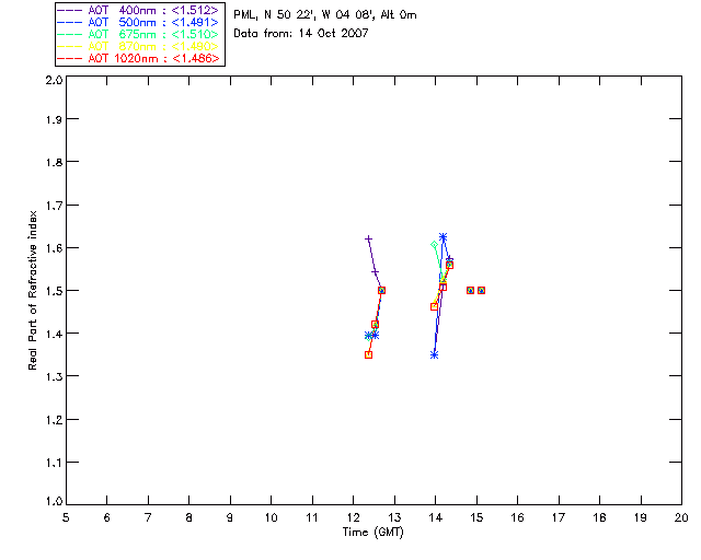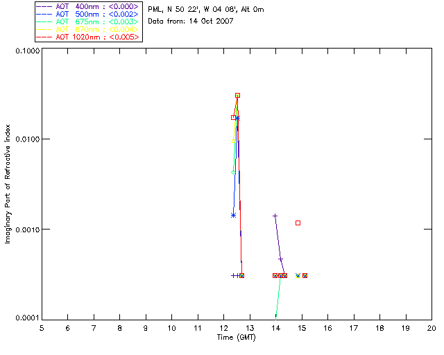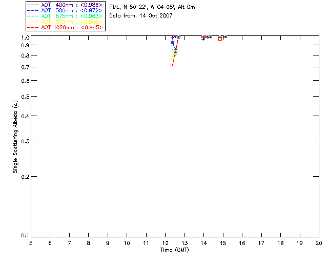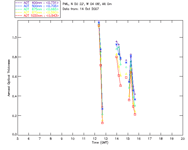 In May 2001 a PREDE POM01-L was installed on the roof of the Plymouth Marine Laboratory to continue the atmospheric correction research of the PML Remote Sensing Group. This was to replace the AERONET CIMEL sunphotometer situated at Rame Head which was decommissioned in 1999. The instrument operates at 7 wavelengths (315, 400, 500, 670, 870, 940 and 1020nm) and scans at pre-set angles away from the solar disk to determine, using the inversion code of Nakajima et al. (2006), various properties of tiny particles called aerosols within the atmospheric column. From these measurements useful atmospheric aerosol parameters such as the Aerosol Optical Thickness (AOT), aerosol size distribution and single scattering albedo can be calculated. Marine aerosols tend to be bigger (D > 1µm) than those generated over the land (0.01 < D < 1µm) and are of a different chemical composition; marine aerosols are salt particles whereas terrestrial aerosols are sulphate compounds.