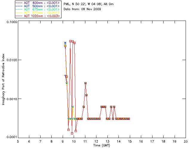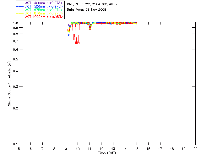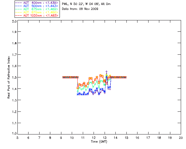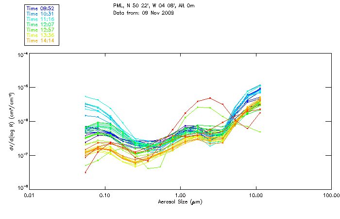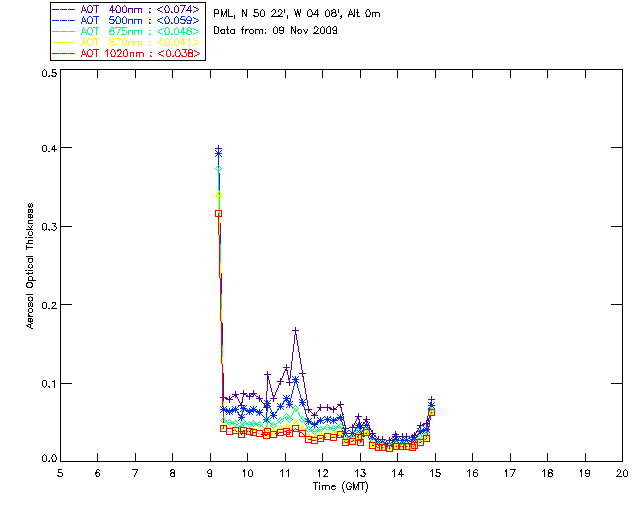 In May 2001 a PREDE POM01-L was installed on the roof of the Plymouth Marine Laboratory to continue the atmospheric correction research of the PML Remote Sensing Group. This was to replace the AERONET CIMEL sunphotometer situated at Rame Head which was decommissioned in 1999. The instrument operates at 7 wavelengths (315, 400, 500, 670, 870, 940 and 1020nm) and scans at pre-set angles away from the solar disk to determine, using the inversion code of Nakajima et al. (2006), various properties of tiny particles called aerosols within the atmospheric column. From these measurements useful atmospheric aerosol parameters such as the Aerosol Optical Thickness (AOT), aerosol size distribution and single scattering albedo can be calculated. Marine aerosols tend to be bigger (D > 1µm) than those generated over the land (0.01 < D < 1µm) and are of a different chemical composition; marine aerosols are salt particles whereas terrestrial aerosols are sulphate compounds.