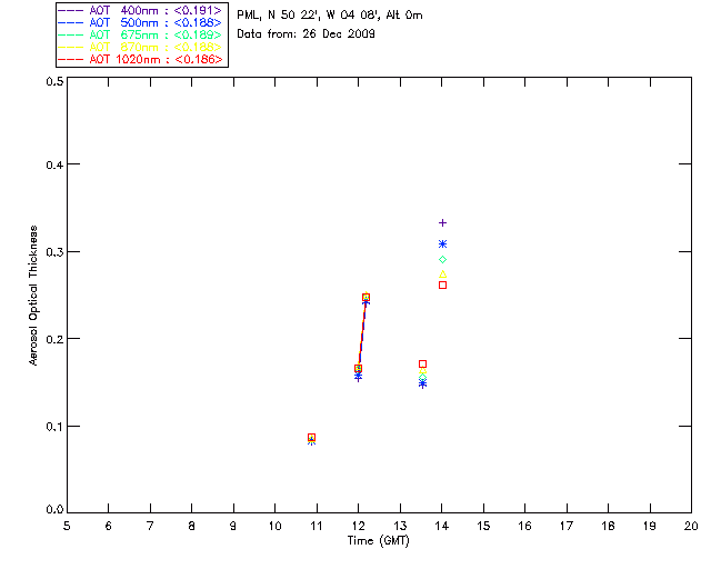 In May 2001 a PREDE POM01-L was installed on the roof of the Plymouth Marine Laboratory to continue the atmospheric correction research of the PML Remote Sensing Group. This was to replace the AERONET CIMEL sunphotometer situated at Rame Head which was decommissioned in 1999. The instrument operates at 7 wavelengths (315, 400, 500, 670, 870, 940 and 1020nm) and scans at pre-set angles away from the solar disk to determine, using the inversion code of Nakajima et al. (2006), various properties of tiny particles called aerosols within the atmospheric column. From these measurements useful atmospheric aerosol parameters such as the Aerosol Optical Thickness (AOT), aerosol size distribution and single scattering albedo can be calculated. Marine aerosols tend to be bigger (D > 1µm) than those generated over the land (0.01 < D < 1µm) and are of a different chemical composition; marine aerosols are salt particles whereas terrestrial aerosols are sulphate compounds.
