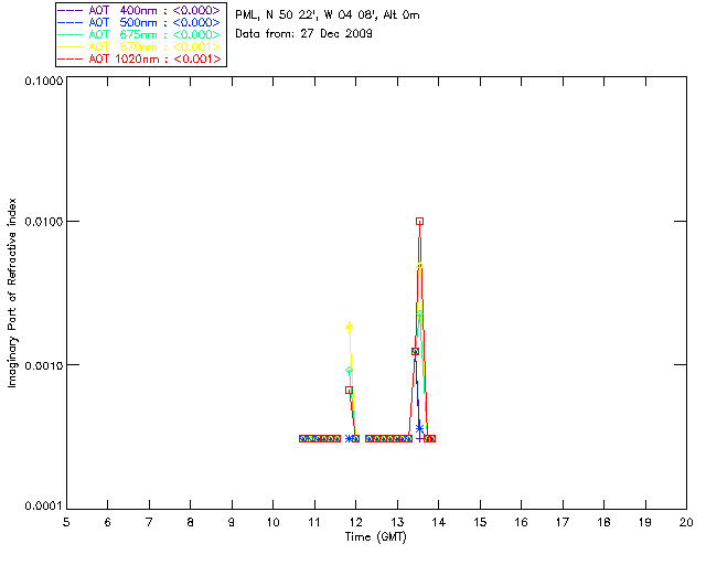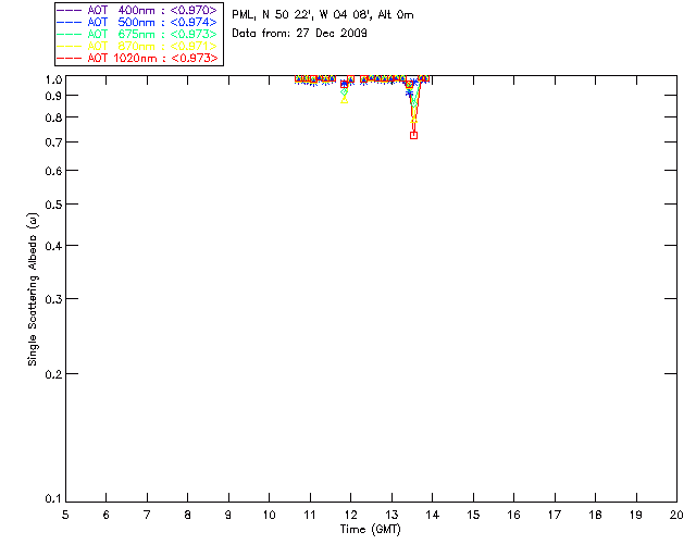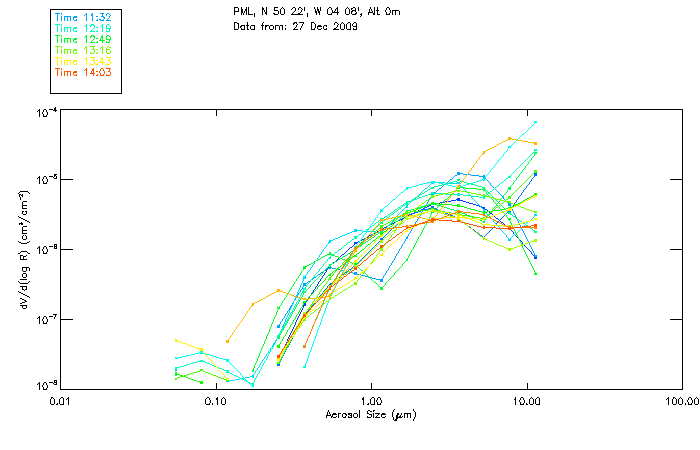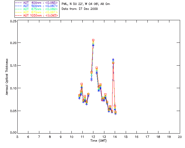 In May 2001 a PREDE POM01-L was installed on the roof of the Plymouth Marine Laboratory to continue the atmospheric correction research of the PML Remote Sensing Group. This was to replace the AERONET CIMEL sunphotometer situated at Rame Head which was decommissioned in 1999. The instrument operates at 7 wavelengths (315, 400, 500, 670, 870, 940 and 1020nm) and scans at pre-set angles away from the solar disk to determine, using the inversion code of Nakajima et al. (2006), various properties of tiny particles called aerosols within the atmospheric column. From these measurements useful atmospheric aerosol parameters such as the Aerosol Optical Thickness (AOT), aerosol size distribution and single scattering albedo can be calculated. Marine aerosols tend to be bigger (D > 1µm) than those generated over the land (0.01 < D < 1µm) and are of a different chemical composition; marine aerosols are salt particles whereas terrestrial aerosols are sulphate compounds.