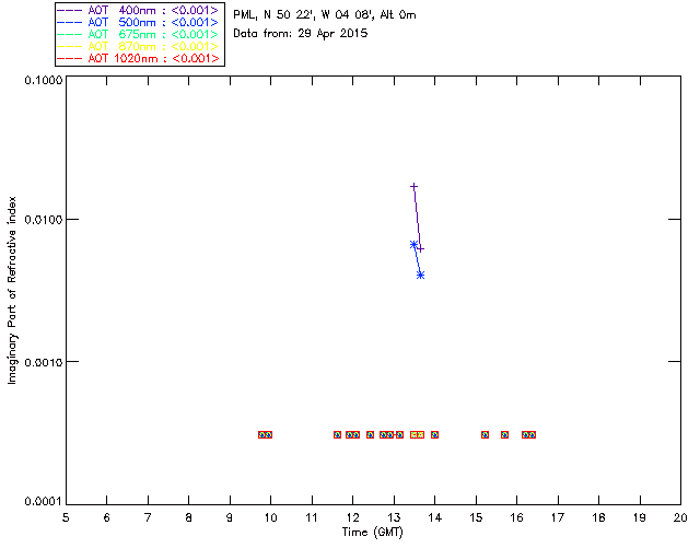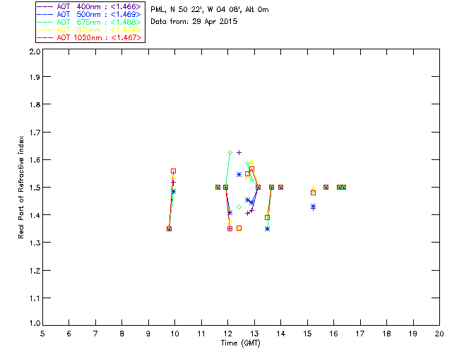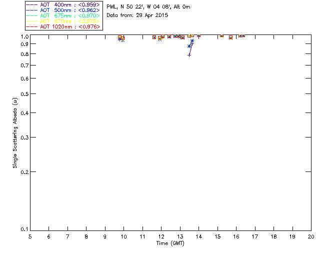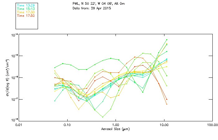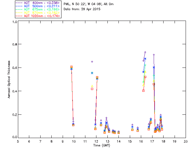 In May 2001 a PREDE POM01-L was installed on the roof of the Plymouth Marine Laboratory to continue the atmospheric correction research of the PML Remote Sensing Group. This was to replace the AERONET CIMEL sunphotometer situated at Rame Head which was decommissioned in 1999. The instrument operates at 7 wavelengths (315, 400, 500, 670, 870, 940 and 1020nm) and scans at pre-set angles away from the solar disk to determine, using the inversion code of Nakajima et al. (2006), various properties of tiny particles called aerosols within the atmospheric column. From these measurements useful atmospheric aerosol parameters such as the Aerosol Optical Thickness (AOT), aerosol size distribution and single scattering albedo can be calculated. Marine aerosols tend to be bigger (D > 1µm) than those generated over the land (0.01 < D < 1µm) and are of a different chemical composition; marine aerosols are salt particles whereas terrestrial aerosols are sulphate compounds.