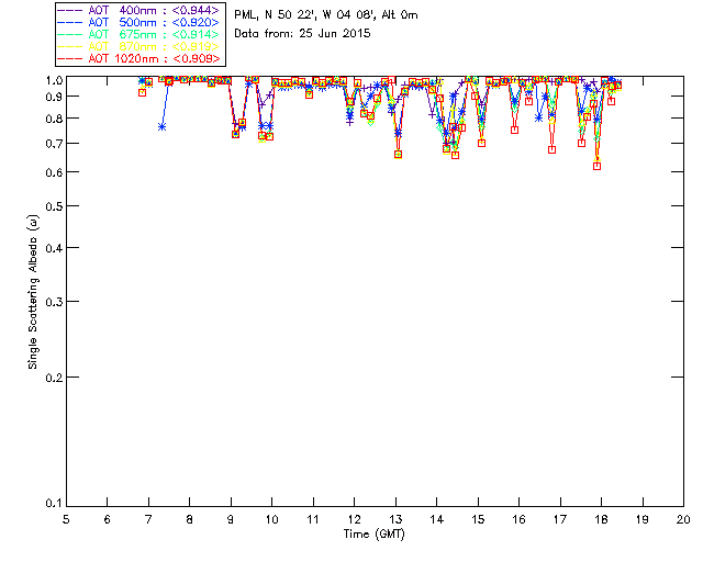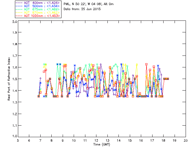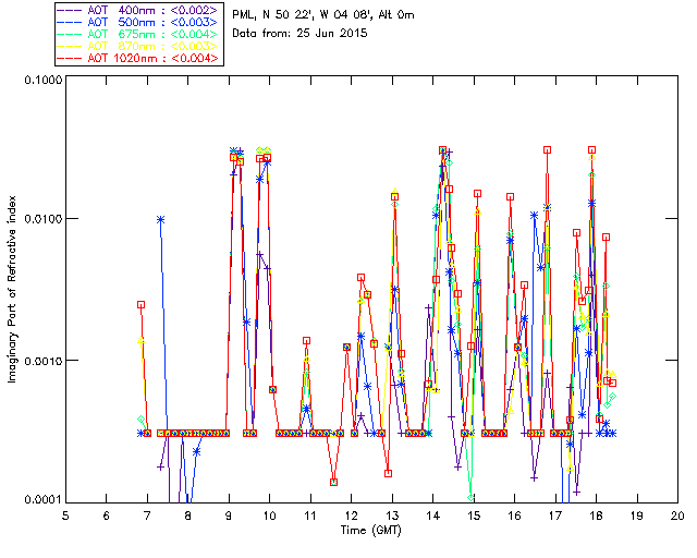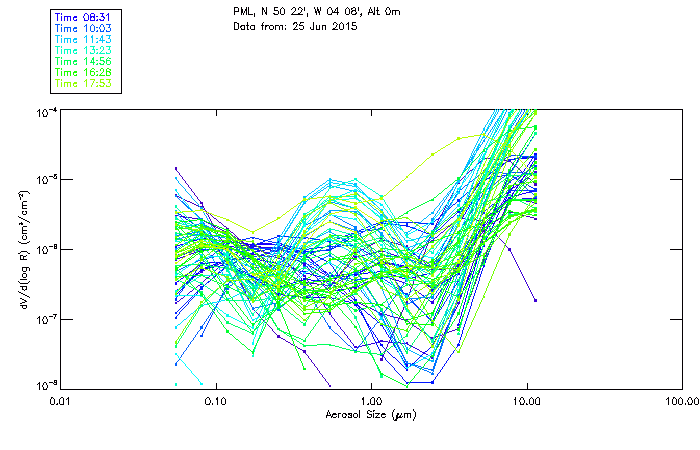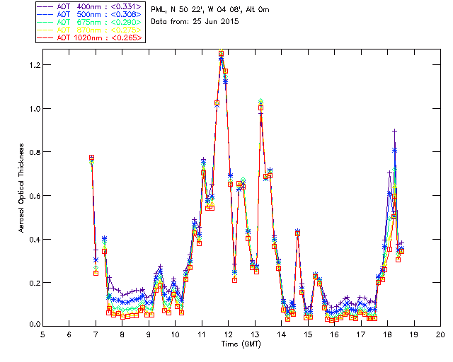 In May 2001 a PREDE POM01-L was installed on the roof of the Plymouth Marine Laboratory to continue the atmospheric correction research of the PML Remote Sensing Group. This was to replace the AERONET CIMEL sunphotometer situated at Rame Head which was decommissioned in 1999. The instrument operates at 7 wavelengths (315, 400, 500, 670, 870, 940 and 1020nm) and scans at pre-set angles away from the solar disk to determine, using the inversion code of Nakajima et al. (2006), various properties of tiny particles called aerosols within the atmospheric column. From these measurements useful atmospheric aerosol parameters such as the Aerosol Optical Thickness (AOT), aerosol size distribution and single scattering albedo can be calculated. Marine aerosols tend to be bigger (D > 1µm) than those generated over the land (0.01 < D < 1µm) and are of a different chemical composition; marine aerosols are salt particles whereas terrestrial aerosols are sulphate compounds.