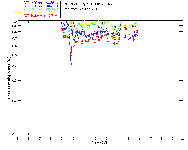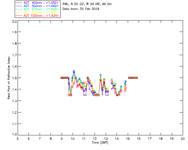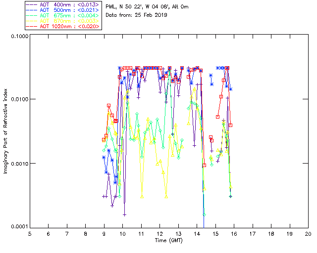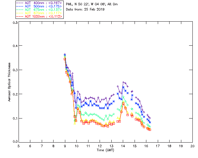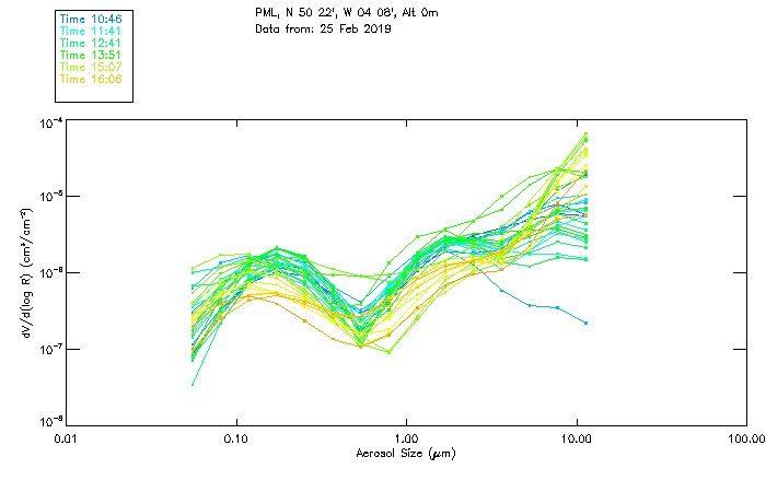 In May 2001 a PREDE POM01-L was installed on the roof of the Plymouth Marine Laboratory to continue the atmospheric correction research of the PML Remote Sensing Group. This was to replace the AERONET CIMEL sunphotometer situated at Rame Head which was decommissioned in 1999. The instrument operates at 7 wavelengths (315, 400, 500, 670, 870, 940 and 1020nm) and scans at pre-set angles away from the solar disk to determine, using the inversion code of Nakajima et al. (2006), various properties of tiny particles called aerosols within the atmospheric column. From these measurements useful atmospheric aerosol parameters such as the Aerosol Optical Thickness (AOT), aerosol size distribution and single scattering albedo can be calculated. Marine aerosols tend to be bigger (D > 1µm) than those generated over the land (0.01 < D < 1µm) and are of a different chemical composition; marine aerosols are salt particles whereas terrestrial aerosols are sulphate compounds.