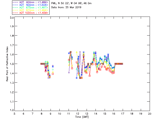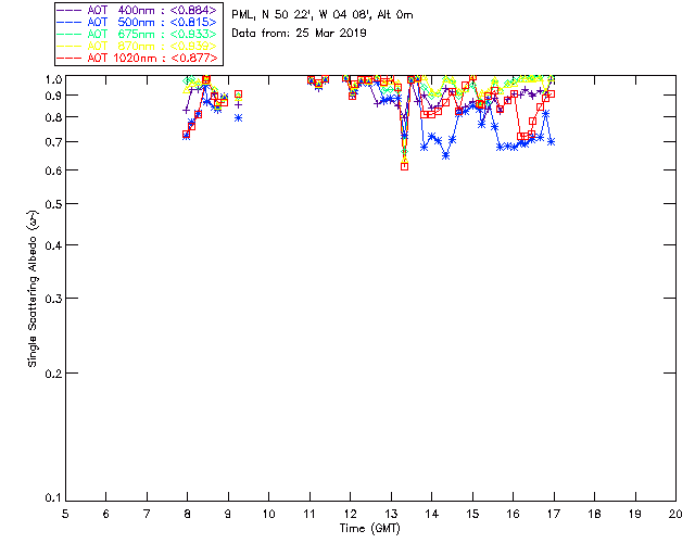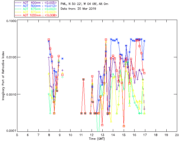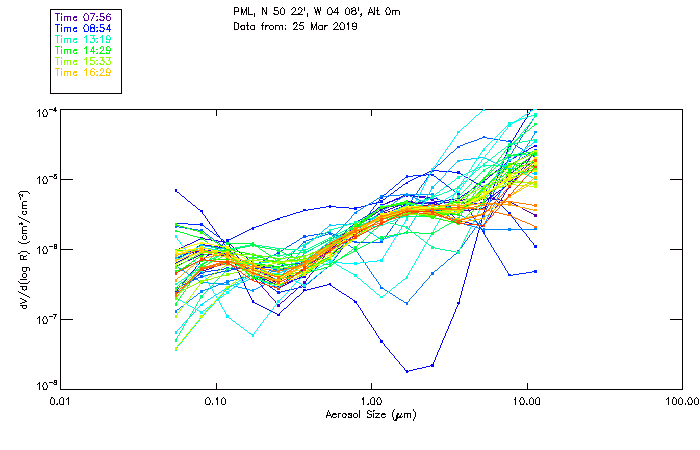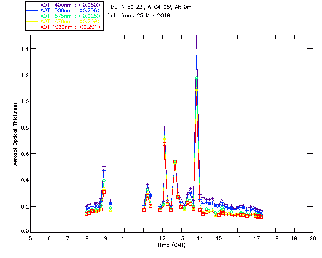 In May 2001 a PREDE POM01-L was installed on the roof of the Plymouth Marine Laboratory to continue the atmospheric correction research of the PML Remote Sensing Group. This was to replace the AERONET CIMEL sunphotometer situated at Rame Head which was decommissioned in 1999. The instrument operates at 7 wavelengths (315, 400, 500, 670, 870, 940 and 1020nm) and scans at pre-set angles away from the solar disk to determine, using the inversion code of Nakajima et al. (2006), various properties of tiny particles called aerosols within the atmospheric column. From these measurements useful atmospheric aerosol parameters such as the Aerosol Optical Thickness (AOT), aerosol size distribution and single scattering albedo can be calculated. Marine aerosols tend to be bigger (D > 1µm) than those generated over the land (0.01 < D < 1µm) and are of a different chemical composition; marine aerosols are salt particles whereas terrestrial aerosols are sulphate compounds.