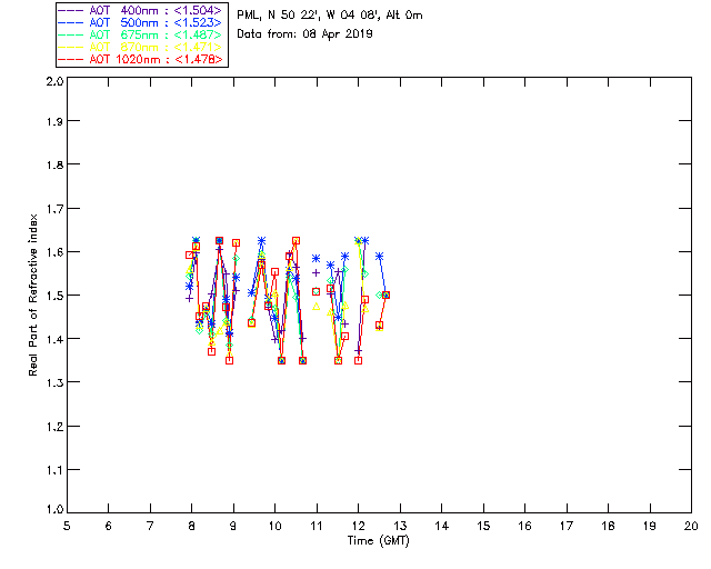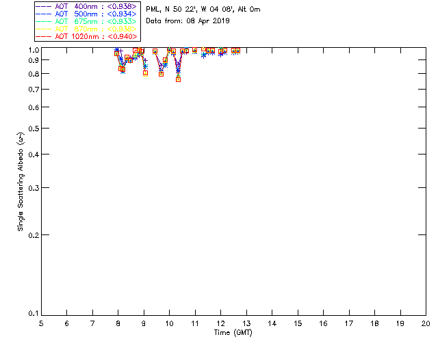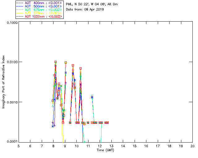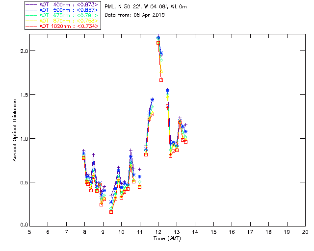 In May 2001 a PREDE POM01-L was installed on the roof of the Plymouth Marine Laboratory to continue the atmospheric correction research of the PML Remote Sensing Group. This was to replace the AERONET CIMEL sunphotometer situated at Rame Head which was decommissioned in 1999. The instrument operates at 7 wavelengths (315, 400, 500, 670, 870, 940 and 1020nm) and scans at pre-set angles away from the solar disk to determine, using the inversion code of Nakajima et al. (2006), various properties of tiny particles called aerosols within the atmospheric column. From these measurements useful atmospheric aerosol parameters such as the Aerosol Optical Thickness (AOT), aerosol size distribution and single scattering albedo can be calculated. Marine aerosols tend to be bigger (D > 1µm) than those generated over the land (0.01 < D < 1µm) and are of a different chemical composition; marine aerosols are salt particles whereas terrestrial aerosols are sulphate compounds.