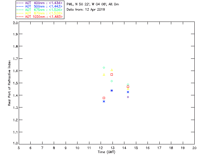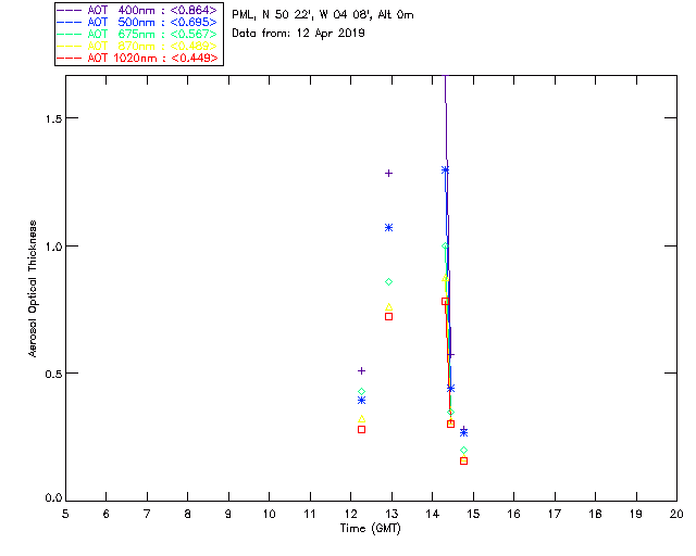 In May 2001 a PREDE POM01-L was installed on the roof of the Plymouth Marine Laboratory to continue the atmospheric correction research of the PML Remote Sensing Group. This was to replace the AERONET CIMEL sunphotometer situated at Rame Head which was decommissioned in 1999. The instrument operates at 7 wavelengths (315, 400, 500, 670, 870, 940 and 1020nm) and scans at pre-set angles away from the solar disk to determine, using the inversion code of Nakajima et al. (2006), various properties of tiny particles called aerosols within the atmospheric column. From these measurements useful atmospheric aerosol parameters such as the Aerosol Optical Thickness (AOT), aerosol size distribution and single scattering albedo can be calculated. Marine aerosols tend to be bigger (D > 1µm) than those generated over the land (0.01 < D < 1µm) and are of a different chemical composition; marine aerosols are salt particles whereas terrestrial aerosols are sulphate compounds.