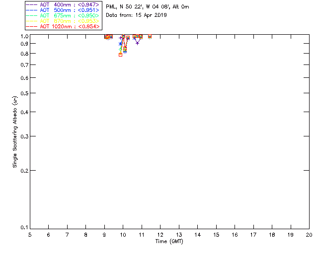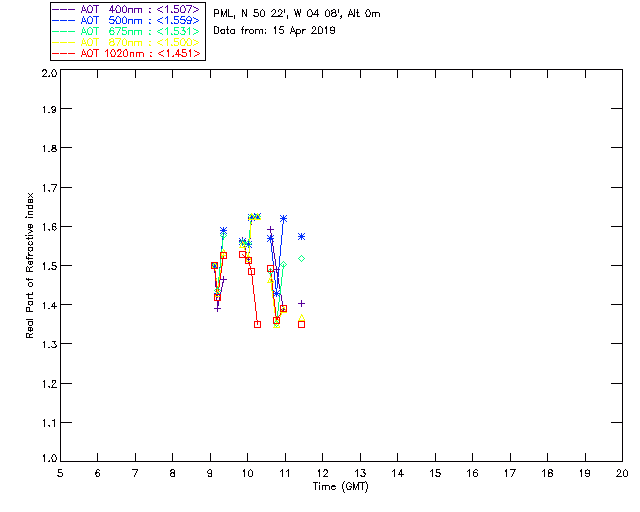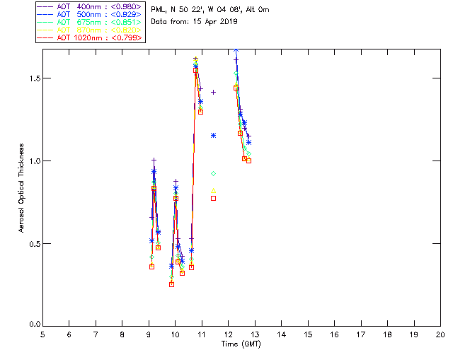 In May 2001 a PREDE POM01-L was installed on the roof of the Plymouth Marine Laboratory to continue the atmospheric correction research of the PML Remote Sensing Group. This was to replace the AERONET CIMEL sunphotometer situated at Rame Head which was decommissioned in 1999. The instrument operates at 7 wavelengths (315, 400, 500, 670, 870, 940 and 1020nm) and scans at pre-set angles away from the solar disk to determine, using the inversion code of Nakajima et al. (2006), various properties of tiny particles called aerosols within the atmospheric column. From these measurements useful atmospheric aerosol parameters such as the Aerosol Optical Thickness (AOT), aerosol size distribution and single scattering albedo can be calculated. Marine aerosols tend to be bigger (D > 1µm) than those generated over the land (0.01 < D < 1µm) and are of a different chemical composition; marine aerosols are salt particles whereas terrestrial aerosols are sulphate compounds.