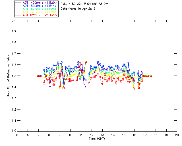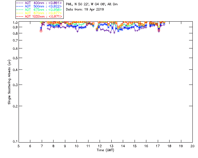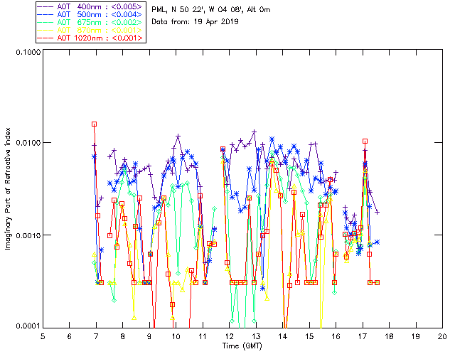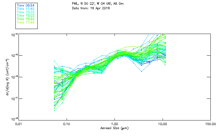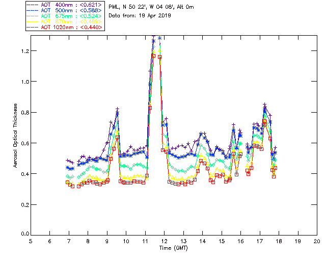 In May 2001 a PREDE POM01-L was installed on the roof of the Plymouth Marine Laboratory to continue the atmospheric correction research of the PML Remote Sensing Group. This was to replace the AERONET CIMEL sunphotometer situated at Rame Head which was decommissioned in 1999. The instrument operates at 7 wavelengths (315, 400, 500, 670, 870, 940 and 1020nm) and scans at pre-set angles away from the solar disk to determine, using the inversion code of Nakajima et al. (2006), various properties of tiny particles called aerosols within the atmospheric column. From these measurements useful atmospheric aerosol parameters such as the Aerosol Optical Thickness (AOT), aerosol size distribution and single scattering albedo can be calculated. Marine aerosols tend to be bigger (D > 1µm) than those generated over the land (0.01 < D < 1µm) and are of a different chemical composition; marine aerosols are salt particles whereas terrestrial aerosols are sulphate compounds.