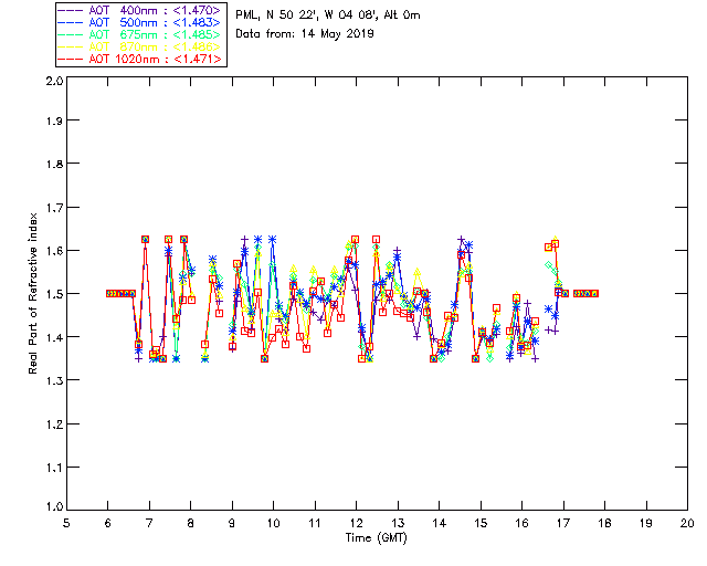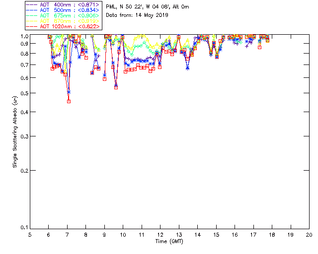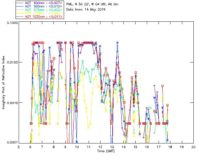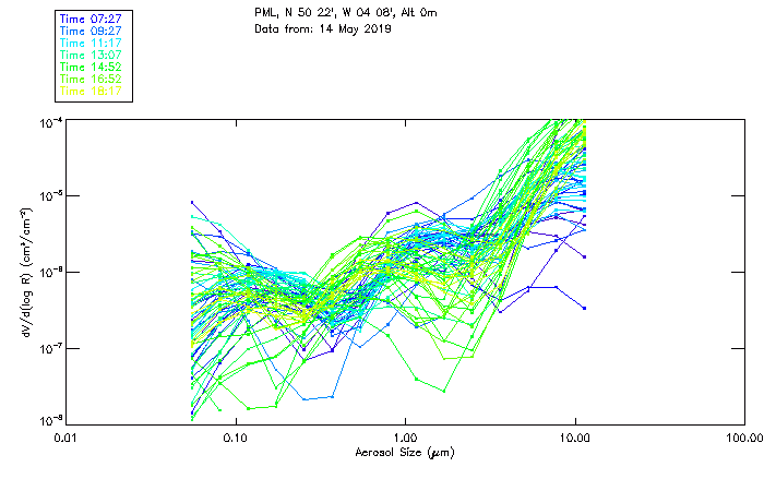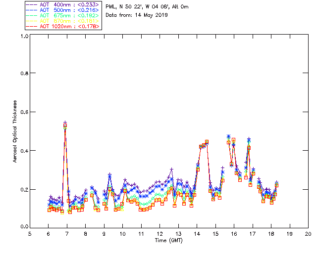 In May 2001 a PREDE POM01-L was installed on the roof of the Plymouth Marine Laboratory to continue the atmospheric correction research of the PML Remote Sensing Group. This was to replace the AERONET CIMEL sunphotometer situated at Rame Head which was decommissioned in 1999. The instrument operates at 7 wavelengths (315, 400, 500, 670, 870, 940 and 1020nm) and scans at pre-set angles away from the solar disk to determine, using the inversion code of Nakajima et al. (2006), various properties of tiny particles called aerosols within the atmospheric column. From these measurements useful atmospheric aerosol parameters such as the Aerosol Optical Thickness (AOT), aerosol size distribution and single scattering albedo can be calculated. Marine aerosols tend to be bigger (D > 1µm) than those generated over the land (0.01 < D < 1µm) and are of a different chemical composition; marine aerosols are salt particles whereas terrestrial aerosols are sulphate compounds.