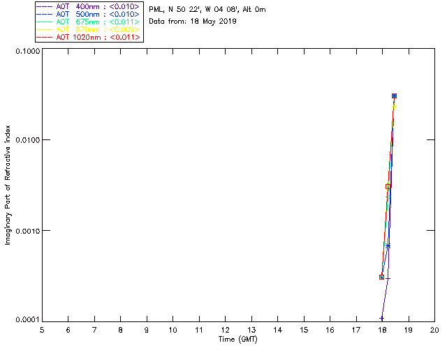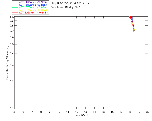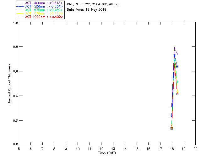 In May 2001 a PREDE POM01-L was installed on the roof of the Plymouth Marine Laboratory to continue the atmospheric correction research of the PML Remote Sensing Group. This was to replace the AERONET CIMEL sunphotometer situated at Rame Head which was decommissioned in 1999. The instrument operates at 7 wavelengths (315, 400, 500, 670, 870, 940 and 1020nm) and scans at pre-set angles away from the solar disk to determine, using the inversion code of Nakajima et al. (2006), various properties of tiny particles called aerosols within the atmospheric column. From these measurements useful atmospheric aerosol parameters such as the Aerosol Optical Thickness (AOT), aerosol size distribution and single scattering albedo can be calculated. Marine aerosols tend to be bigger (D > 1µm) than those generated over the land (0.01 < D < 1µm) and are of a different chemical composition; marine aerosols are salt particles whereas terrestrial aerosols are sulphate compounds.