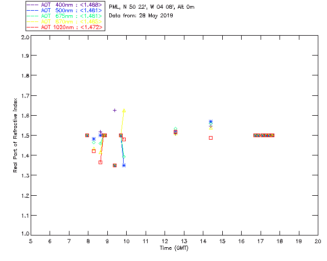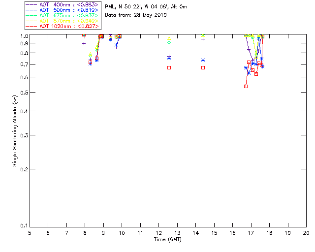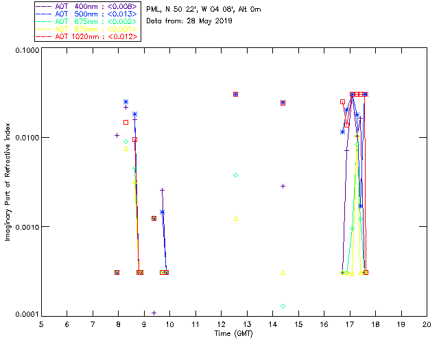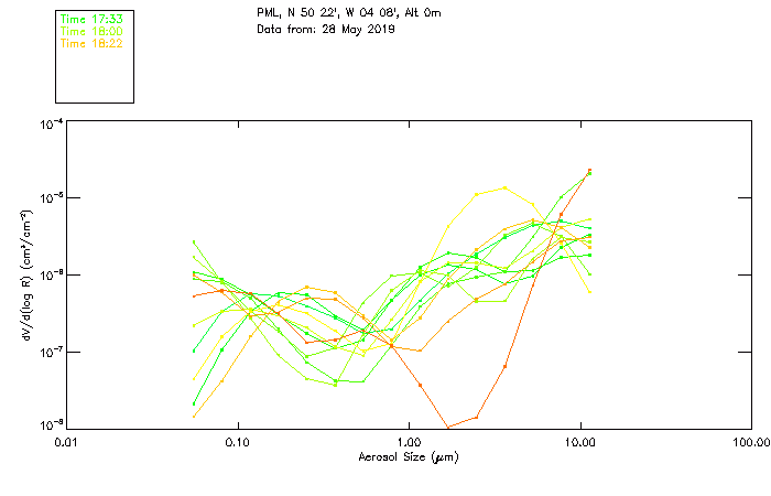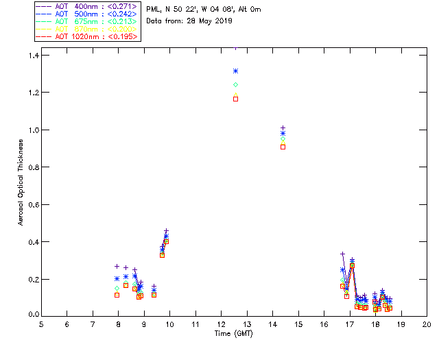 In May 2001 a PREDE POM01-L was installed on the roof of the Plymouth Marine Laboratory to continue the atmospheric correction research of the PML Remote Sensing Group. This was to replace the AERONET CIMEL sunphotometer situated at Rame Head which was decommissioned in 1999. The instrument operates at 7 wavelengths (315, 400, 500, 670, 870, 940 and 1020nm) and scans at pre-set angles away from the solar disk to determine, using the inversion code of Nakajima et al. (2006), various properties of tiny particles called aerosols within the atmospheric column. From these measurements useful atmospheric aerosol parameters such as the Aerosol Optical Thickness (AOT), aerosol size distribution and single scattering albedo can be calculated. Marine aerosols tend to be bigger (D > 1µm) than those generated over the land (0.01 < D < 1µm) and are of a different chemical composition; marine aerosols are salt particles whereas terrestrial aerosols are sulphate compounds.
