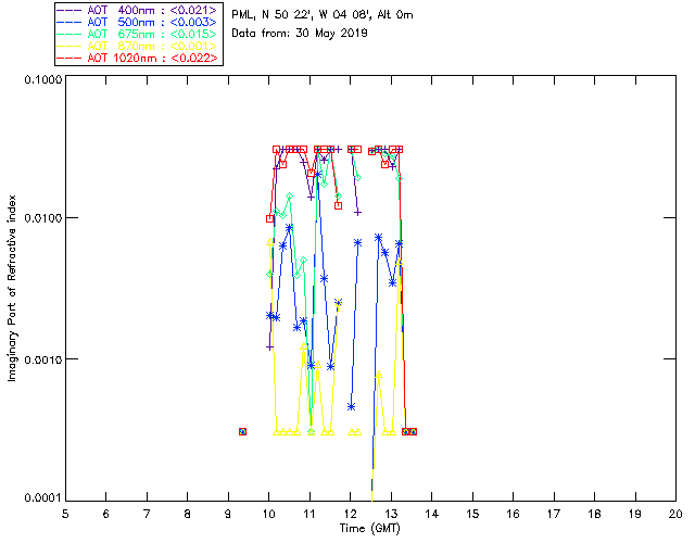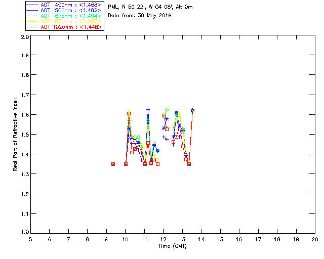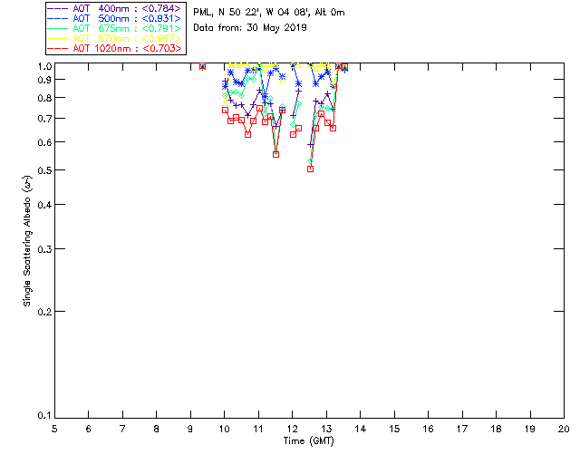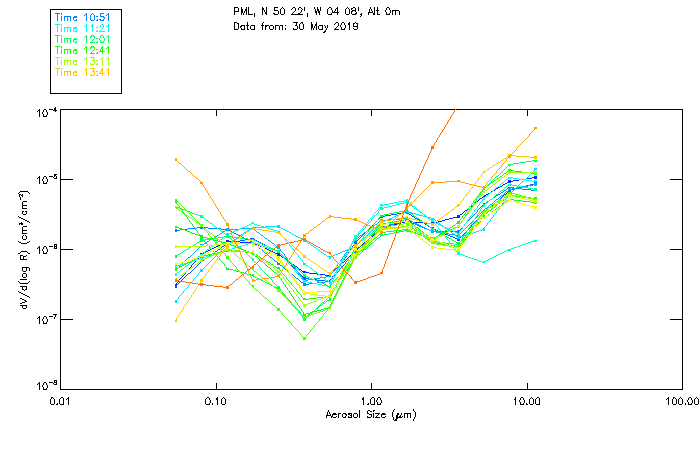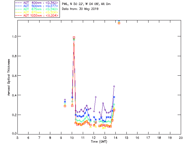 In May 2001 a PREDE POM01-L was installed on the roof of the Plymouth Marine Laboratory to continue the atmospheric correction research of the PML Remote Sensing Group. This was to replace the AERONET CIMEL sunphotometer situated at Rame Head which was decommissioned in 1999. The instrument operates at 7 wavelengths (315, 400, 500, 670, 870, 940 and 1020nm) and scans at pre-set angles away from the solar disk to determine, using the inversion code of Nakajima et al. (2006), various properties of tiny particles called aerosols within the atmospheric column. From these measurements useful atmospheric aerosol parameters such as the Aerosol Optical Thickness (AOT), aerosol size distribution and single scattering albedo can be calculated. Marine aerosols tend to be bigger (D > 1µm) than those generated over the land (0.01 < D < 1µm) and are of a different chemical composition; marine aerosols are salt particles whereas terrestrial aerosols are sulphate compounds.