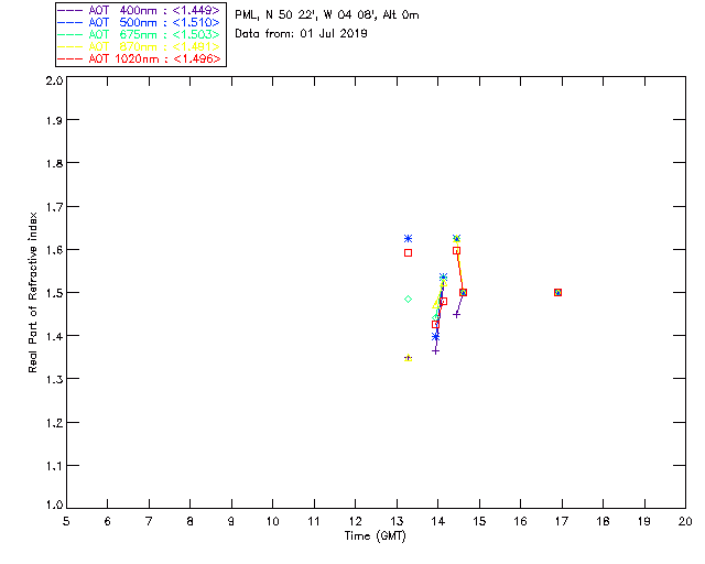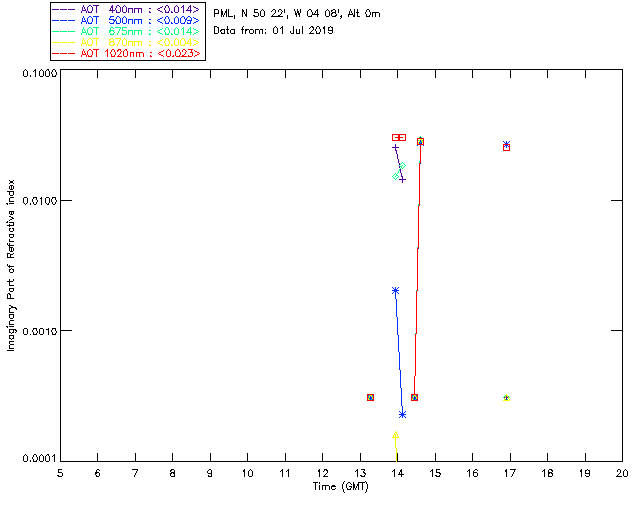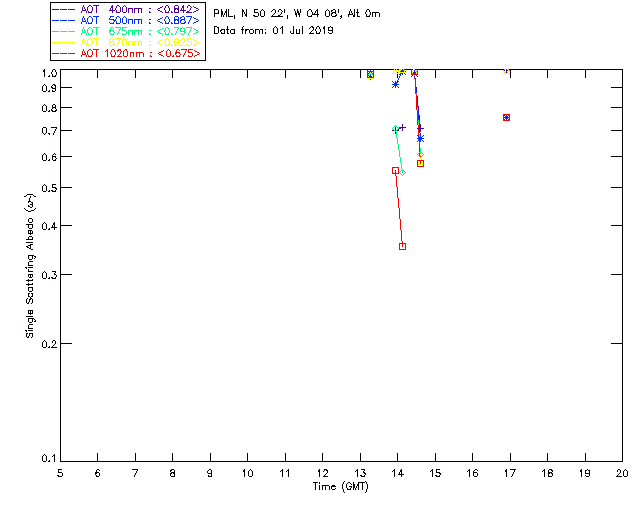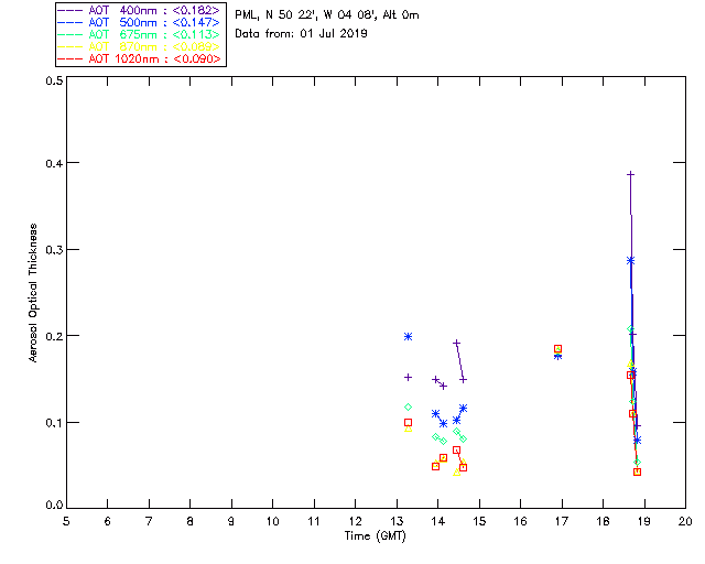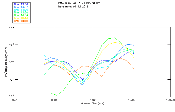 In May 2001 a PREDE POM01-L was installed on the roof of the Plymouth Marine Laboratory to continue the atmospheric correction research of the PML Remote Sensing Group. This was to replace the AERONET CIMEL sunphotometer situated at Rame Head which was decommissioned in 1999. The instrument operates at 7 wavelengths (315, 400, 500, 670, 870, 940 and 1020nm) and scans at pre-set angles away from the solar disk to determine, using the inversion code of Nakajima et al. (2006), various properties of tiny particles called aerosols within the atmospheric column. From these measurements useful atmospheric aerosol parameters such as the Aerosol Optical Thickness (AOT), aerosol size distribution and single scattering albedo can be calculated. Marine aerosols tend to be bigger (D > 1µm) than those generated over the land (0.01 < D < 1µm) and are of a different chemical composition; marine aerosols are salt particles whereas terrestrial aerosols are sulphate compounds.