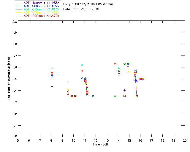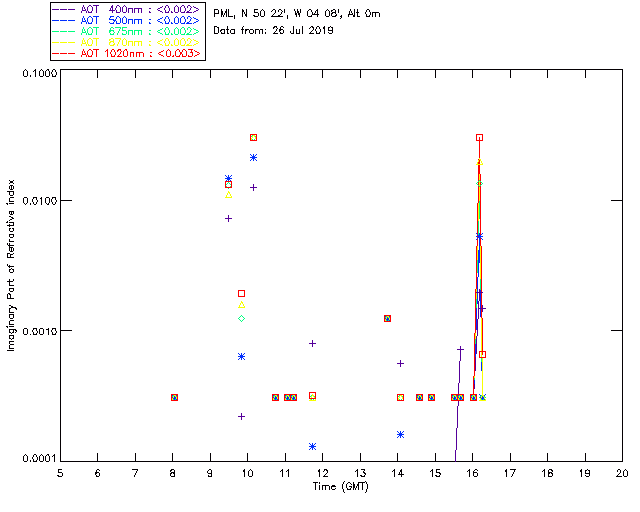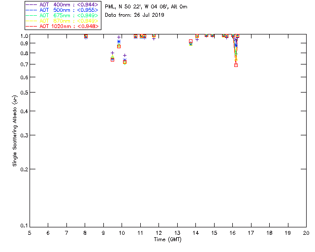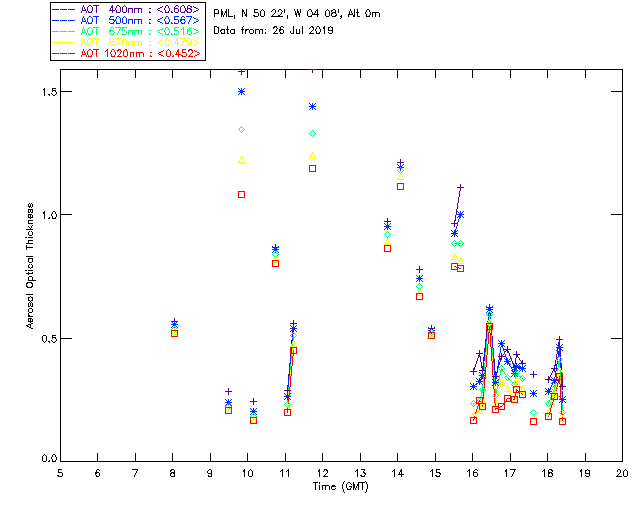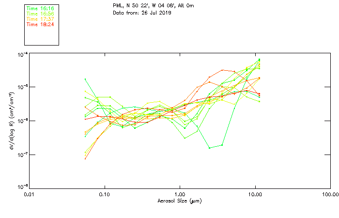 In May 2001 a PREDE POM01-L was installed on the roof of the Plymouth Marine Laboratory to continue the atmospheric correction research of the PML Remote Sensing Group. This was to replace the AERONET CIMEL sunphotometer situated at Rame Head which was decommissioned in 1999. The instrument operates at 7 wavelengths (315, 400, 500, 670, 870, 940 and 1020nm) and scans at pre-set angles away from the solar disk to determine, using the inversion code of Nakajima et al. (2006), various properties of tiny particles called aerosols within the atmospheric column. From these measurements useful atmospheric aerosol parameters such as the Aerosol Optical Thickness (AOT), aerosol size distribution and single scattering albedo can be calculated. Marine aerosols tend to be bigger (D > 1µm) than those generated over the land (0.01 < D < 1µm) and are of a different chemical composition; marine aerosols are salt particles whereas terrestrial aerosols are sulphate compounds.