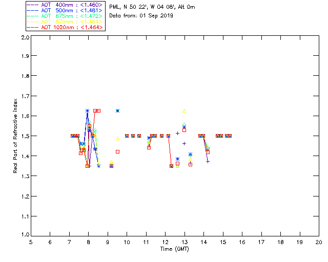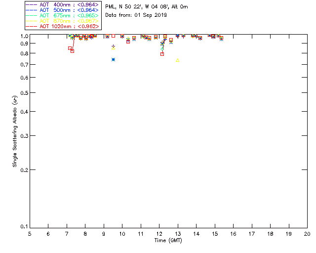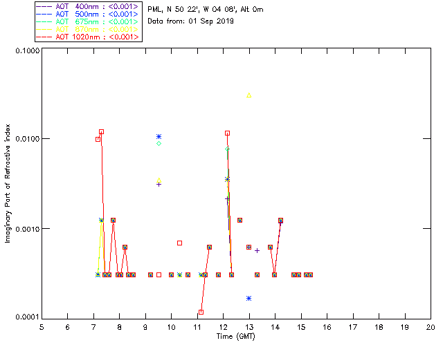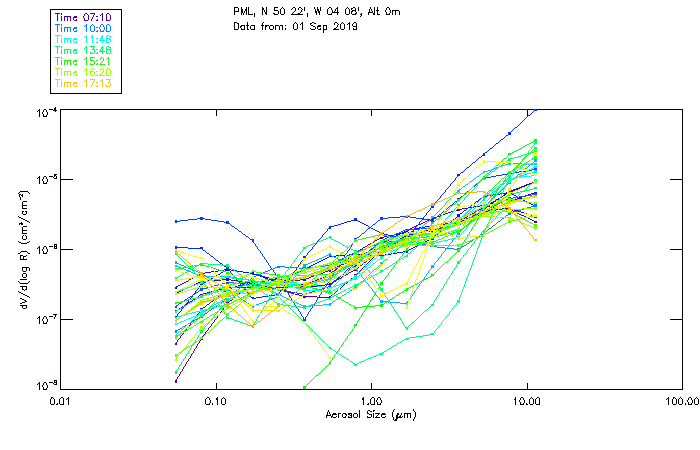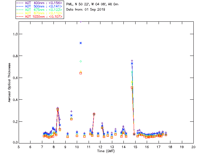 In May 2001 a PREDE POM01-L was installed on the roof of the Plymouth Marine Laboratory to continue the atmospheric correction research of the PML Remote Sensing Group. This was to replace the AERONET CIMEL sunphotometer situated at Rame Head which was decommissioned in 1999. The instrument operates at 7 wavelengths (315, 400, 500, 670, 870, 940 and 1020nm) and scans at pre-set angles away from the solar disk to determine, using the inversion code of Nakajima et al. (2006), various properties of tiny particles called aerosols within the atmospheric column. From these measurements useful atmospheric aerosol parameters such as the Aerosol Optical Thickness (AOT), aerosol size distribution and single scattering albedo can be calculated. Marine aerosols tend to be bigger (D > 1µm) than those generated over the land (0.01 < D < 1µm) and are of a different chemical composition; marine aerosols are salt particles whereas terrestrial aerosols are sulphate compounds.