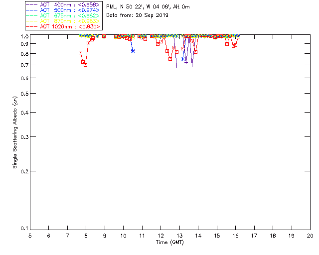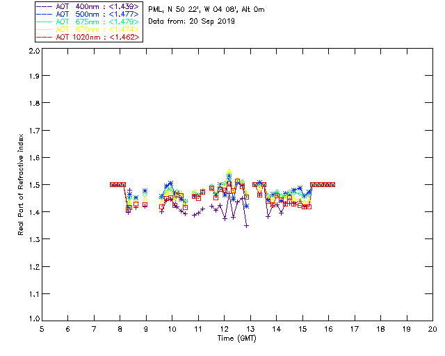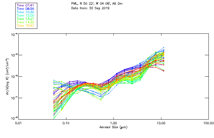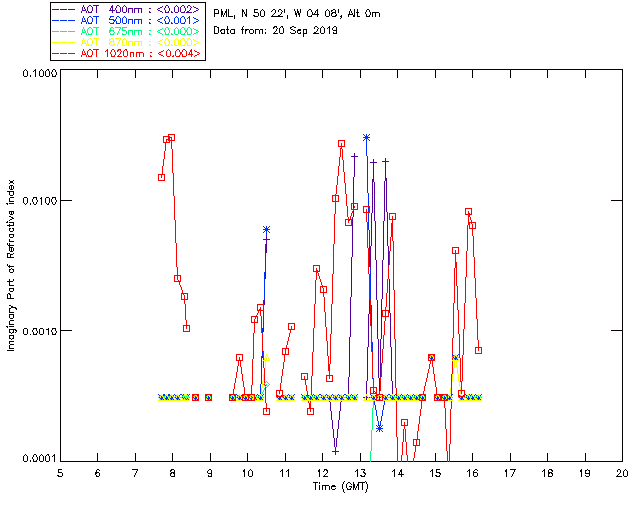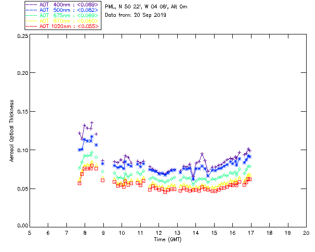In May 2001 a PREDE POM01-L was installed on the roof of the Plymouth Marine Laboratory to continue the atmospheric correction research of the PML Remote Sensing Group. This was to replace the AERONET CIMEL sunphotometer situated at Rame Head which was decommissioned in 1999. The instrument operates at 7 wavelengths (315, 400, 500, 670, 870, 940 and 1020nm) and scans at pre-set angles away from the solar disk to determine, using the inversion code of Nakajima et al. (2006), various properties of tiny particles called aerosols within the atmospheric column. From these measurements useful atmospheric aerosol parameters such as the Aerosol Optical Thickness (AOT), aerosol size distribution and single scattering albedo can be calculated. Marine aerosols tend to be bigger (D > 1µm) than those generated over the land (0.01 < D < 1µm) and are of a different chemical composition; marine aerosols are salt particles whereas terrestrial aerosols are sulphate compounds.
