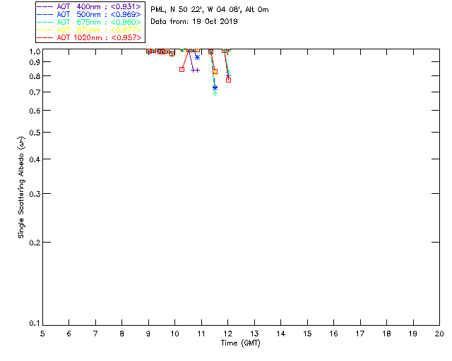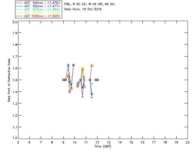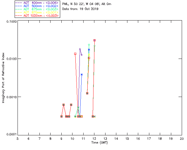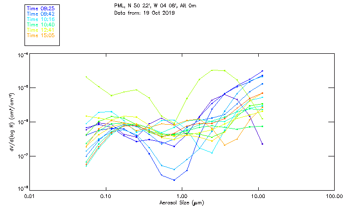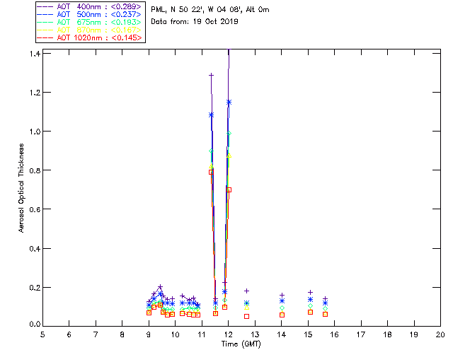 In May 2001 a PREDE POM01-L was installed on the roof of the Plymouth Marine Laboratory to continue the atmospheric correction research of the PML Remote Sensing Group. This was to replace the AERONET CIMEL sunphotometer situated at Rame Head which was decommissioned in 1999. The instrument operates at 7 wavelengths (315, 400, 500, 670, 870, 940 and 1020nm) and scans at pre-set angles away from the solar disk to determine, using the inversion code of Nakajima et al. (2006), various properties of tiny particles called aerosols within the atmospheric column. From these measurements useful atmospheric aerosol parameters such as the Aerosol Optical Thickness (AOT), aerosol size distribution and single scattering albedo can be calculated. Marine aerosols tend to be bigger (D > 1µm) than those generated over the land (0.01 < D < 1µm) and are of a different chemical composition; marine aerosols are salt particles whereas terrestrial aerosols are sulphate compounds.