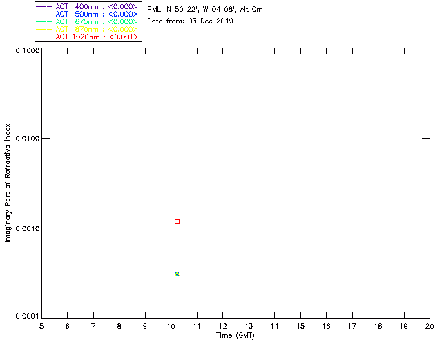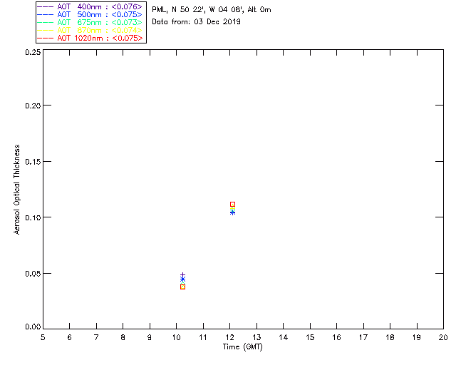 In May 2001 a PREDE POM01-L was installed on the roof of the Plymouth Marine Laboratory to continue the atmospheric correction research of the PML Remote Sensing Group. This was to replace the AERONET CIMEL sunphotometer situated at Rame Head which was decommissioned in 1999. The instrument operates at 7 wavelengths (315, 400, 500, 670, 870, 940 and 1020nm) and scans at pre-set angles away from the solar disk to determine, using the inversion code of Nakajima et al. (2006), various properties of tiny particles called aerosols within the atmospheric column. From these measurements useful atmospheric aerosol parameters such as the Aerosol Optical Thickness (AOT), aerosol size distribution and single scattering albedo can be calculated. Marine aerosols tend to be bigger (D > 1µm) than those generated over the land (0.01 < D < 1µm) and are of a different chemical composition; marine aerosols are salt particles whereas terrestrial aerosols are sulphate compounds.
