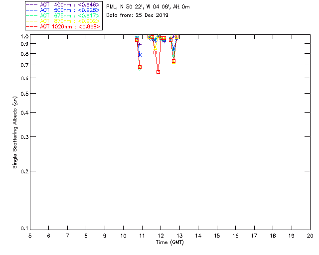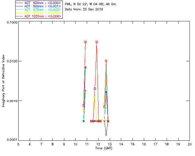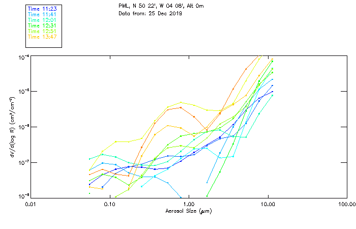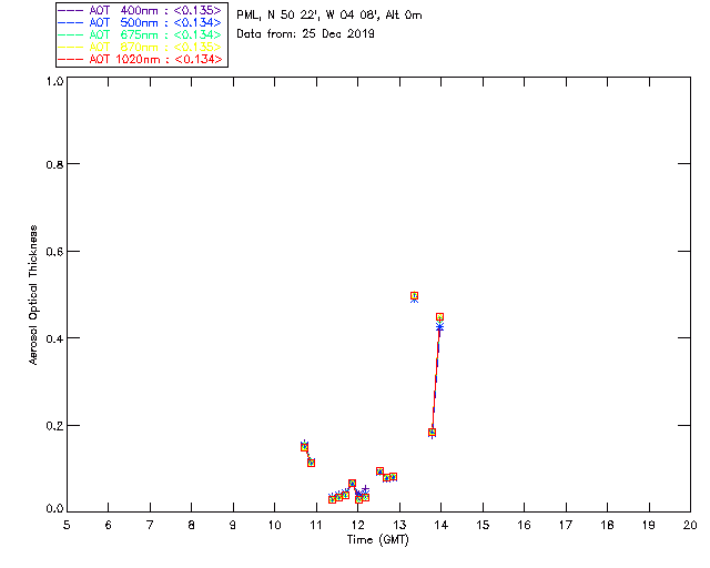 In May 2001 a PREDE POM01-L was installed on the roof of the Plymouth Marine Laboratory to continue the atmospheric correction research of the PML Remote Sensing Group. This was to replace the AERONET CIMEL sunphotometer situated at Rame Head which was decommissioned in 1999. The instrument operates at 7 wavelengths (315, 400, 500, 670, 870, 940 and 1020nm) and scans at pre-set angles away from the solar disk to determine, using the inversion code of Nakajima et al. (2006), various properties of tiny particles called aerosols within the atmospheric column. From these measurements useful atmospheric aerosol parameters such as the Aerosol Optical Thickness (AOT), aerosol size distribution and single scattering albedo can be calculated. Marine aerosols tend to be bigger (D > 1µm) than those generated over the land (0.01 < D < 1µm) and are of a different chemical composition; marine aerosols are salt particles whereas terrestrial aerosols are sulphate compounds.