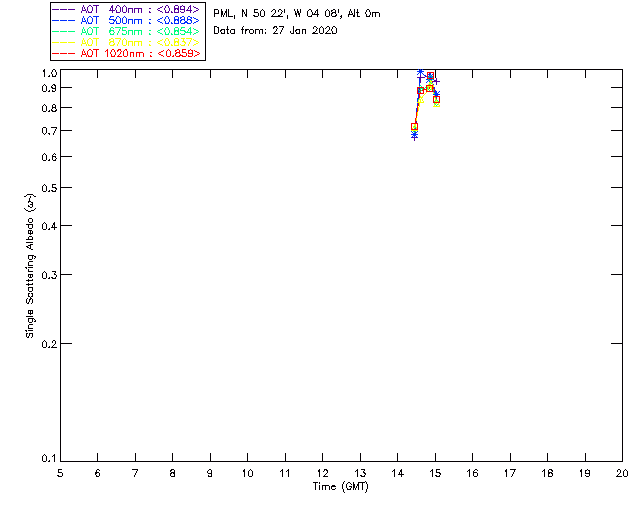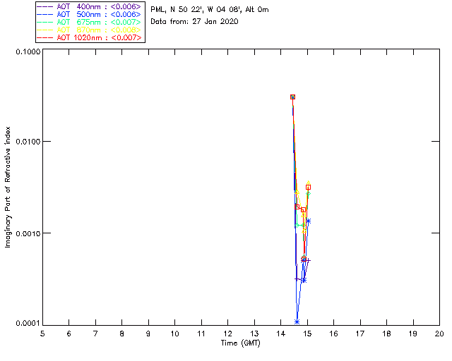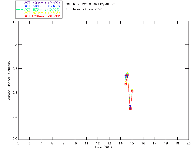 In May 2001 a PREDE POM01-L was installed on the roof of the Plymouth Marine Laboratory to continue the atmospheric correction research of the PML Remote Sensing Group. This was to replace the AERONET CIMEL sunphotometer situated at Rame Head which was decommissioned in 1999. The instrument operates at 7 wavelengths (315, 400, 500, 670, 870, 940 and 1020nm) and scans at pre-set angles away from the solar disk to determine, using the inversion code of Nakajima et al. (2006), various properties of tiny particles called aerosols within the atmospheric column. From these measurements useful atmospheric aerosol parameters such as the Aerosol Optical Thickness (AOT), aerosol size distribution and single scattering albedo can be calculated. Marine aerosols tend to be bigger (D > 1µm) than those generated over the land (0.01 < D < 1µm) and are of a different chemical composition; marine aerosols are salt particles whereas terrestrial aerosols are sulphate compounds.