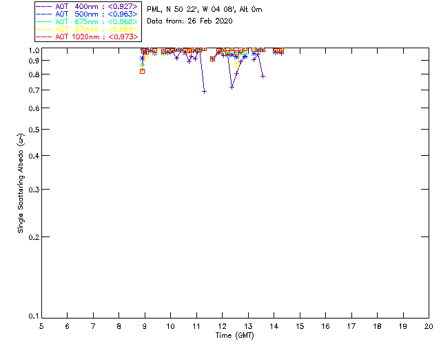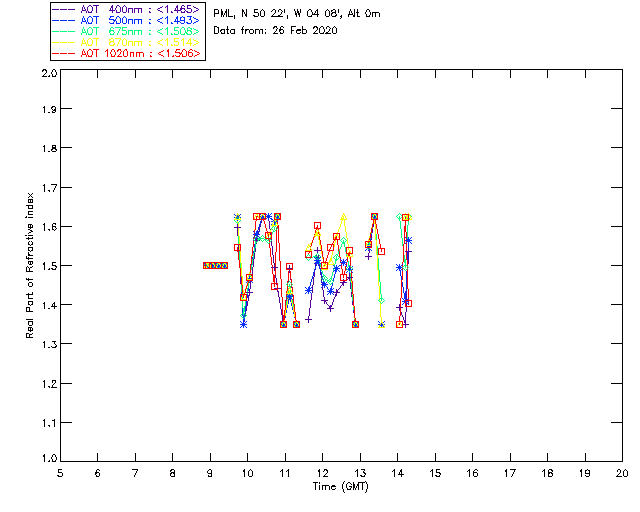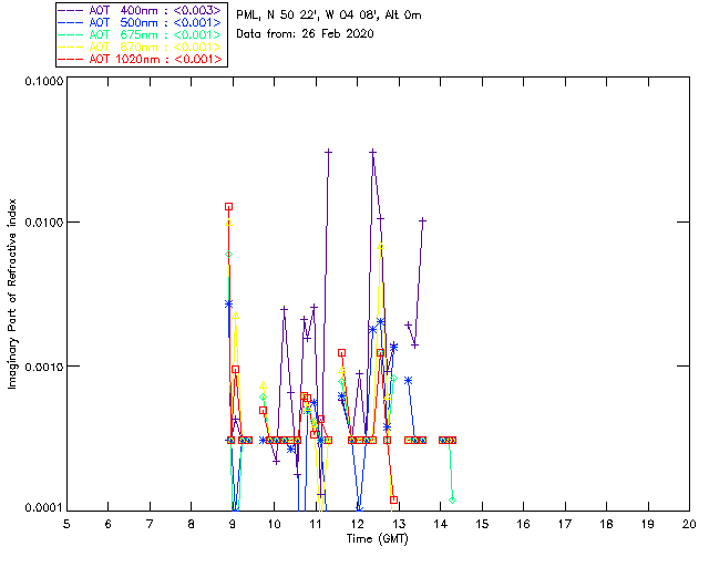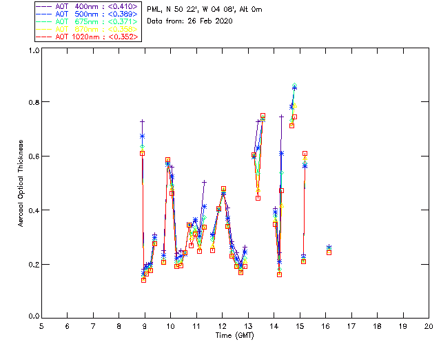 In May 2001 a PREDE POM01-L was installed on the roof of the Plymouth Marine Laboratory to continue the atmospheric correction research of the PML Remote Sensing Group. This was to replace the AERONET CIMEL sunphotometer situated at Rame Head which was decommissioned in 1999. The instrument operates at 7 wavelengths (315, 400, 500, 670, 870, 940 and 1020nm) and scans at pre-set angles away from the solar disk to determine, using the inversion code of Nakajima et al. (2006), various properties of tiny particles called aerosols within the atmospheric column. From these measurements useful atmospheric aerosol parameters such as the Aerosol Optical Thickness (AOT), aerosol size distribution and single scattering albedo can be calculated. Marine aerosols tend to be bigger (D > 1µm) than those generated over the land (0.01 < D < 1µm) and are of a different chemical composition; marine aerosols are salt particles whereas terrestrial aerosols are sulphate compounds.
