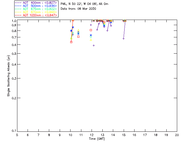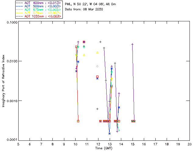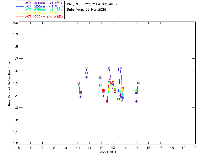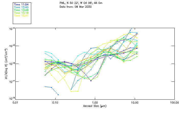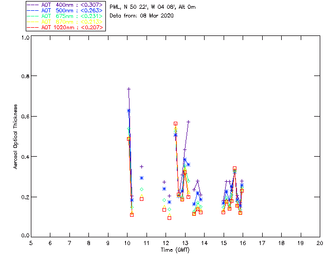In May 2001 a PREDE POM01-L was installed on the roof of the Plymouth Marine Laboratory to continue the atmospheric correction research of the PML Remote Sensing Group. This was to replace the AERONET CIMEL sunphotometer situated at Rame Head which was decommissioned in 1999. The instrument operates at 7 wavelengths (315, 400, 500, 670, 870, 940 and 1020nm) and scans at pre-set angles away from the solar disk to determine, using the inversion code of Nakajima et al. (2006), various properties of tiny particles called aerosols within the atmospheric column. From these measurements useful atmospheric aerosol parameters such as the Aerosol Optical Thickness (AOT), aerosol size distribution and single scattering albedo can be calculated. Marine aerosols tend to be bigger (D > 1µm) than those generated over the land (0.01 < D < 1µm) and are of a different chemical composition; marine aerosols are salt particles whereas terrestrial aerosols are sulphate compounds.