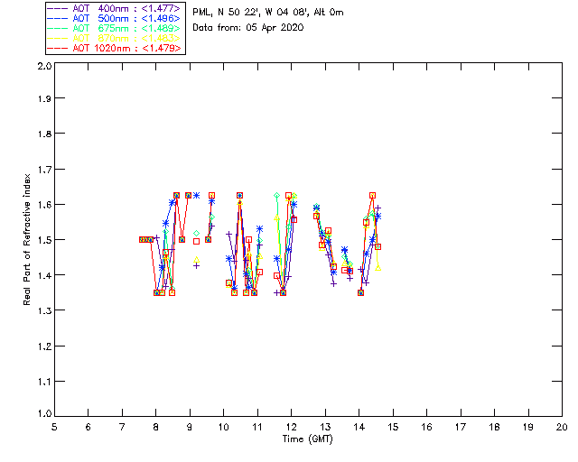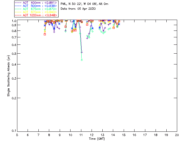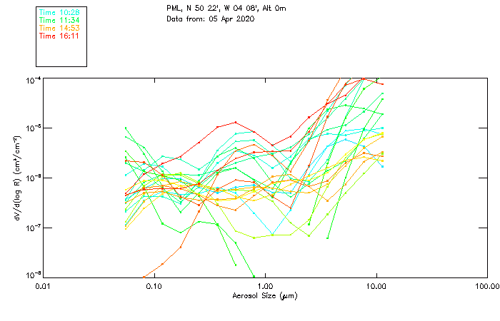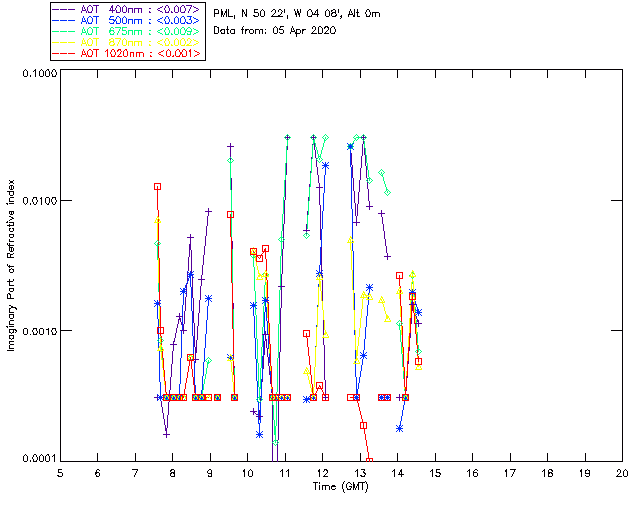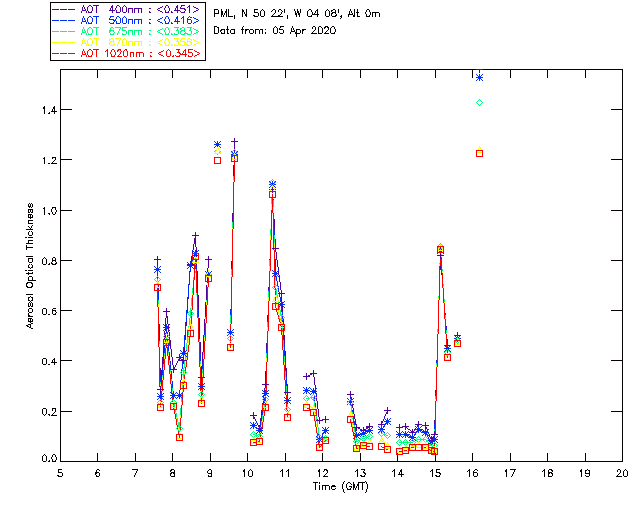 In May 2001 a PREDE POM01-L was installed on the roof of the Plymouth Marine Laboratory to continue the atmospheric correction research of the PML Remote Sensing Group. This was to replace the AERONET CIMEL sunphotometer situated at Rame Head which was decommissioned in 1999. The instrument operates at 7 wavelengths (315, 400, 500, 670, 870, 940 and 1020nm) and scans at pre-set angles away from the solar disk to determine, using the inversion code of Nakajima et al. (2006), various properties of tiny particles called aerosols within the atmospheric column. From these measurements useful atmospheric aerosol parameters such as the Aerosol Optical Thickness (AOT), aerosol size distribution and single scattering albedo can be calculated. Marine aerosols tend to be bigger (D > 1µm) than those generated over the land (0.01 < D < 1µm) and are of a different chemical composition; marine aerosols are salt particles whereas terrestrial aerosols are sulphate compounds.