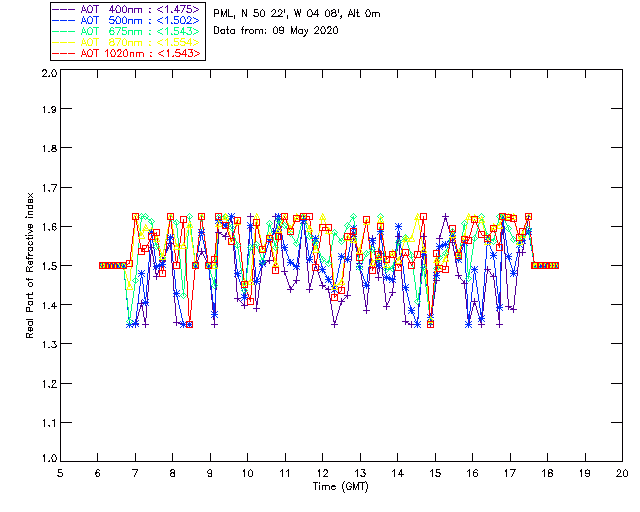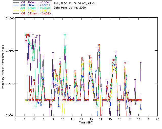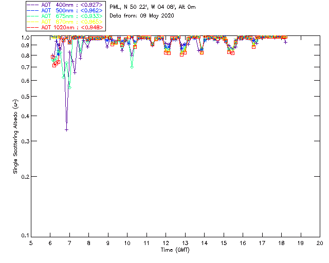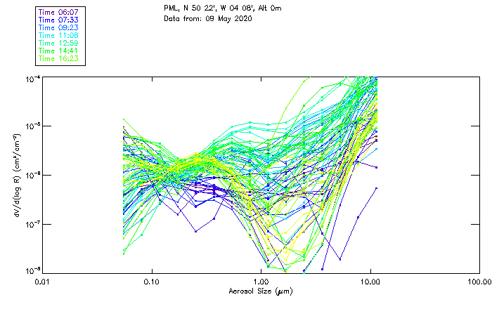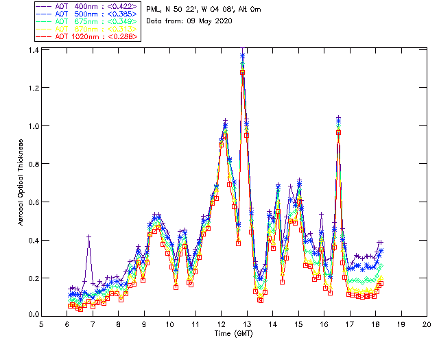 In May 2001 a PREDE POM01-L was installed on the roof of the Plymouth Marine Laboratory to continue the atmospheric correction research of the PML Remote Sensing Group. This was to replace the AERONET CIMEL sunphotometer situated at Rame Head which was decommissioned in 1999. The instrument operates at 7 wavelengths (315, 400, 500, 670, 870, 940 and 1020nm) and scans at pre-set angles away from the solar disk to determine, using the inversion code of Nakajima et al. (2006), various properties of tiny particles called aerosols within the atmospheric column. From these measurements useful atmospheric aerosol parameters such as the Aerosol Optical Thickness (AOT), aerosol size distribution and single scattering albedo can be calculated. Marine aerosols tend to be bigger (D > 1µm) than those generated over the land (0.01 < D < 1µm) and are of a different chemical composition; marine aerosols are salt particles whereas terrestrial aerosols are sulphate compounds.
