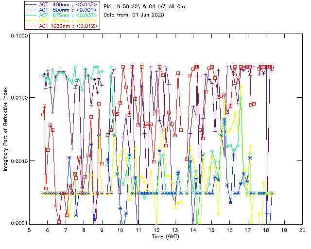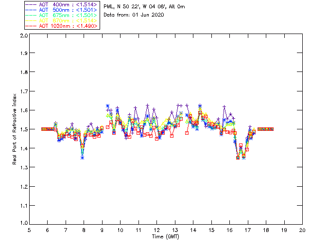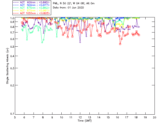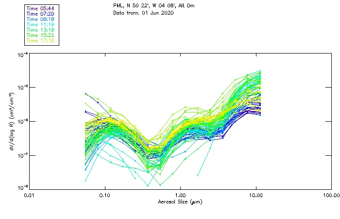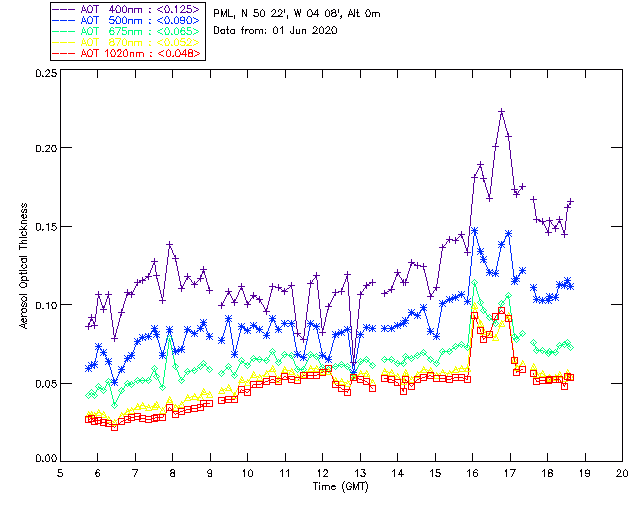 In May 2001 a PREDE POM01-L was installed on the roof of the Plymouth Marine Laboratory to continue the atmospheric correction research of the PML Remote Sensing Group. This was to replace the AERONET CIMEL sunphotometer situated at Rame Head which was decommissioned in 1999. The instrument operates at 7 wavelengths (315, 400, 500, 670, 870, 940 and 1020nm) and scans at pre-set angles away from the solar disk to determine, using the inversion code of Nakajima et al. (2006), various properties of tiny particles called aerosols within the atmospheric column. From these measurements useful atmospheric aerosol parameters such as the Aerosol Optical Thickness (AOT), aerosol size distribution and single scattering albedo can be calculated. Marine aerosols tend to be bigger (D > 1µm) than those generated over the land (0.01 < D < 1µm) and are of a different chemical composition; marine aerosols are salt particles whereas terrestrial aerosols are sulphate compounds.