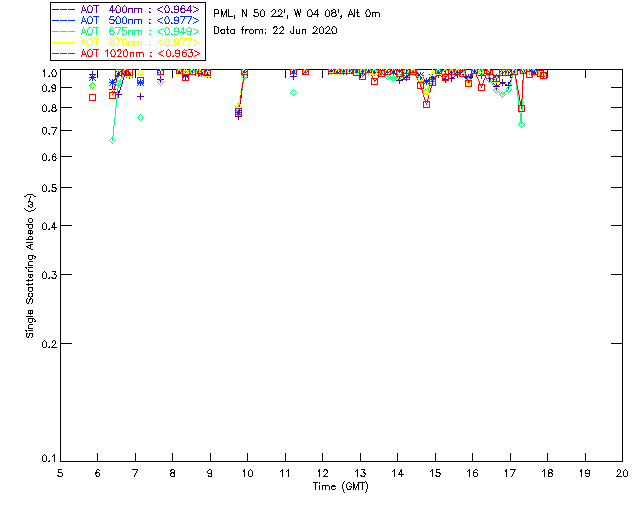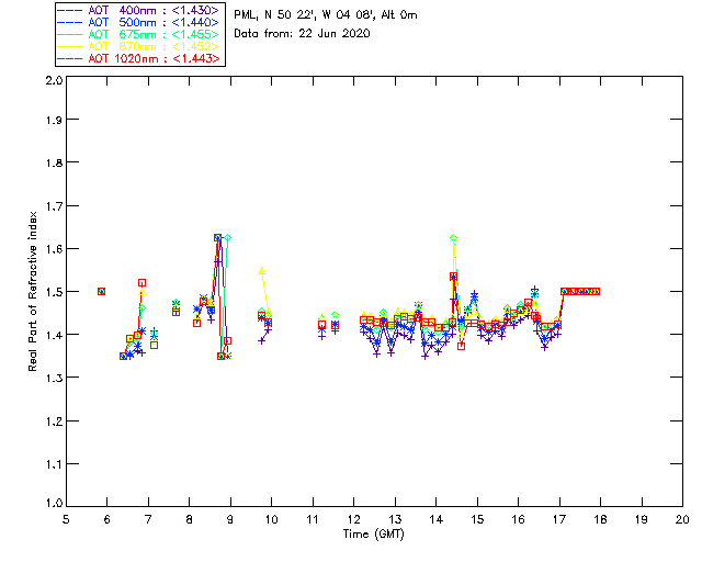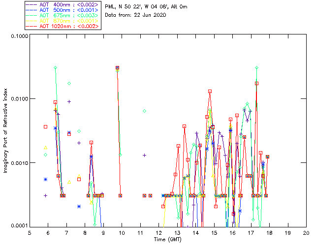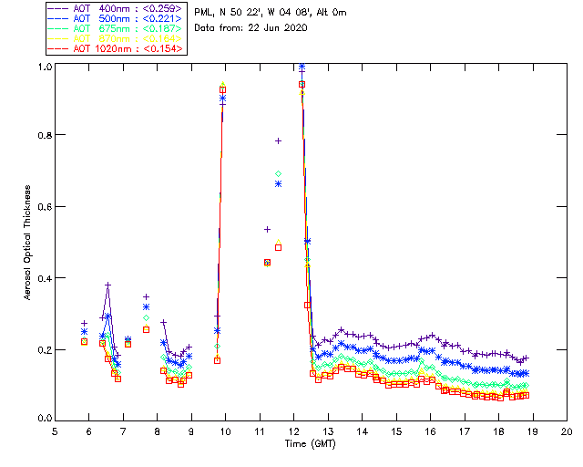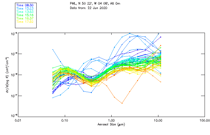 In May 2001 a PREDE POM01-L was installed on the roof of the Plymouth Marine Laboratory to continue the atmospheric correction research of the PML Remote Sensing Group. This was to replace the AERONET CIMEL sunphotometer situated at Rame Head which was decommissioned in 1999. The instrument operates at 7 wavelengths (315, 400, 500, 670, 870, 940 and 1020nm) and scans at pre-set angles away from the solar disk to determine, using the inversion code of Nakajima et al. (2006), various properties of tiny particles called aerosols within the atmospheric column. From these measurements useful atmospheric aerosol parameters such as the Aerosol Optical Thickness (AOT), aerosol size distribution and single scattering albedo can be calculated. Marine aerosols tend to be bigger (D > 1µm) than those generated over the land (0.01 < D < 1µm) and are of a different chemical composition; marine aerosols are salt particles whereas terrestrial aerosols are sulphate compounds.