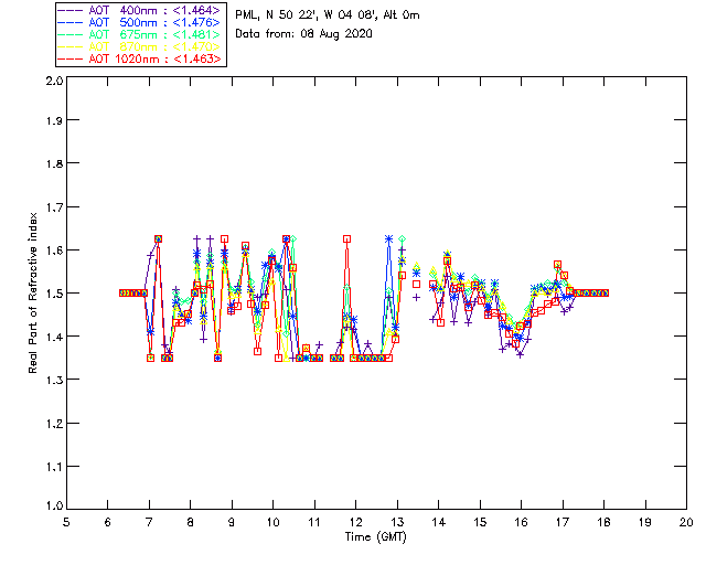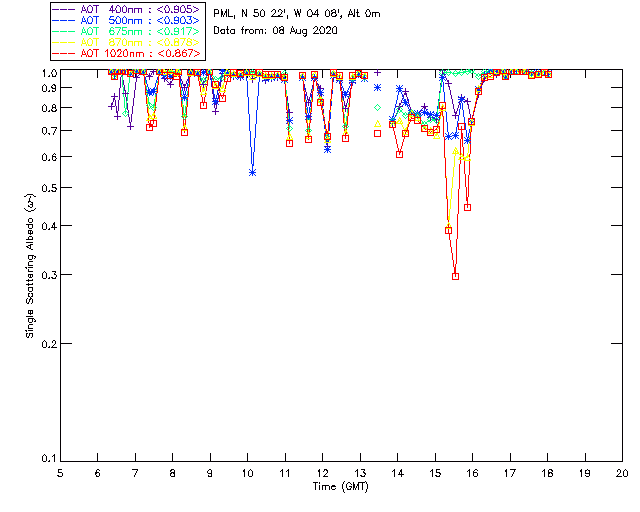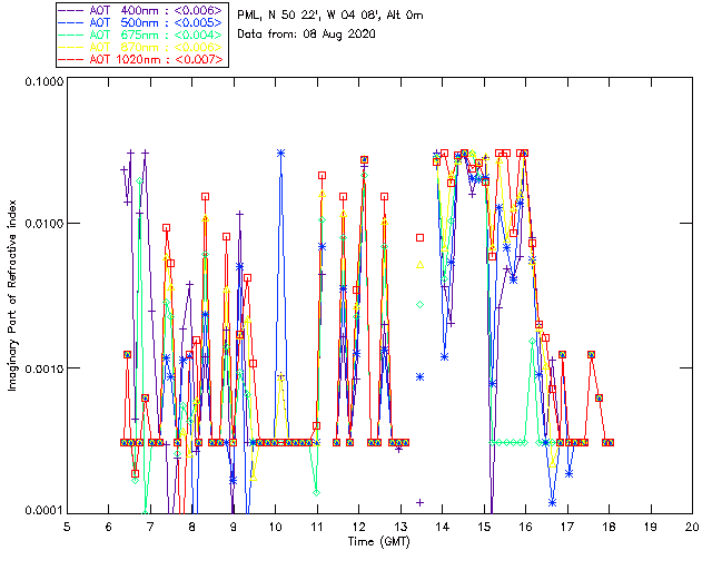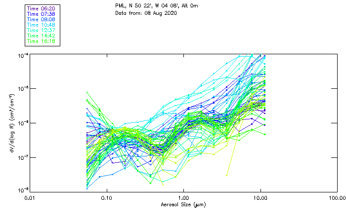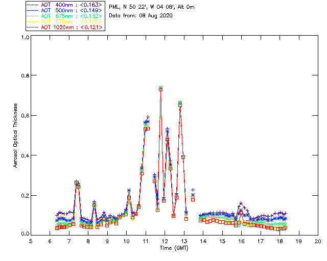 In May 2001 a PREDE POM01-L was installed on the roof of the Plymouth Marine Laboratory to continue the atmospheric correction research of the PML Remote Sensing Group. This was to replace the AERONET CIMEL sunphotometer situated at Rame Head which was decommissioned in 1999. The instrument operates at 7 wavelengths (315, 400, 500, 670, 870, 940 and 1020nm) and scans at pre-set angles away from the solar disk to determine, using the inversion code of Nakajima et al. (2006), various properties of tiny particles called aerosols within the atmospheric column. From these measurements useful atmospheric aerosol parameters such as the Aerosol Optical Thickness (AOT), aerosol size distribution and single scattering albedo can be calculated. Marine aerosols tend to be bigger (D > 1µm) than those generated over the land (0.01 < D < 1µm) and are of a different chemical composition; marine aerosols are salt particles whereas terrestrial aerosols are sulphate compounds.