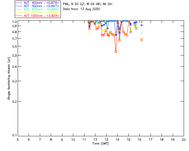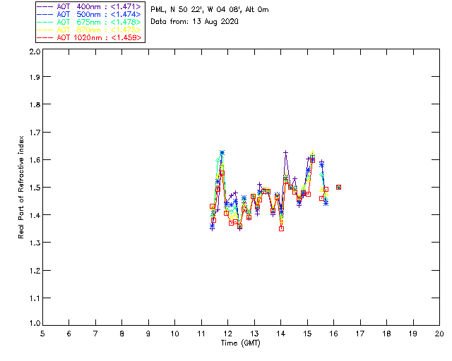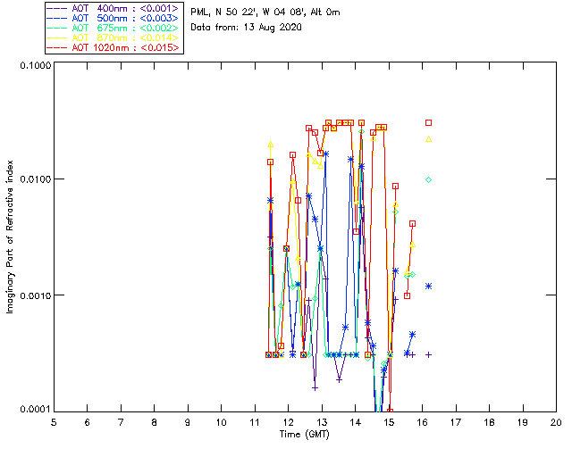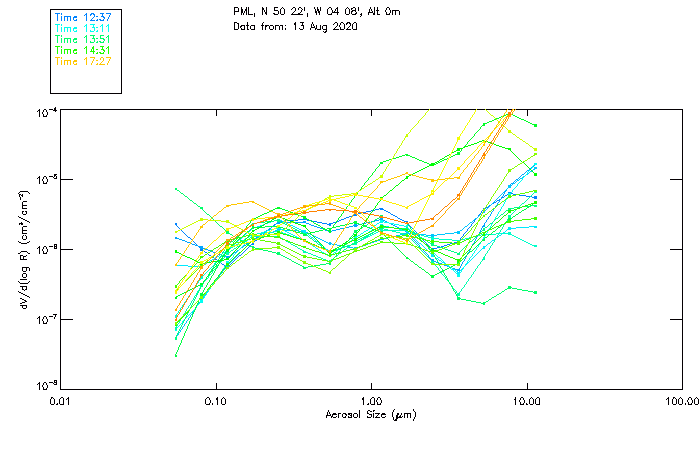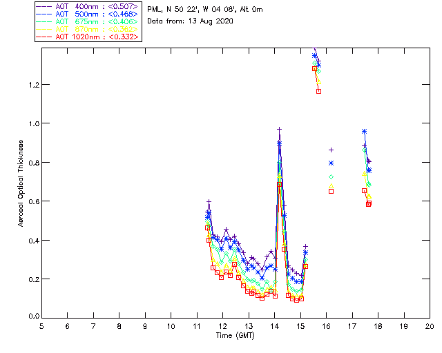 In May 2001 a PREDE POM01-L was installed on the roof of the Plymouth Marine Laboratory to continue the atmospheric correction research of the PML Remote Sensing Group. This was to replace the AERONET CIMEL sunphotometer situated at Rame Head which was decommissioned in 1999. The instrument operates at 7 wavelengths (315, 400, 500, 670, 870, 940 and 1020nm) and scans at pre-set angles away from the solar disk to determine, using the inversion code of Nakajima et al. (2006), various properties of tiny particles called aerosols within the atmospheric column. From these measurements useful atmospheric aerosol parameters such as the Aerosol Optical Thickness (AOT), aerosol size distribution and single scattering albedo can be calculated. Marine aerosols tend to be bigger (D > 1µm) than those generated over the land (0.01 < D < 1µm) and are of a different chemical composition; marine aerosols are salt particles whereas terrestrial aerosols are sulphate compounds.