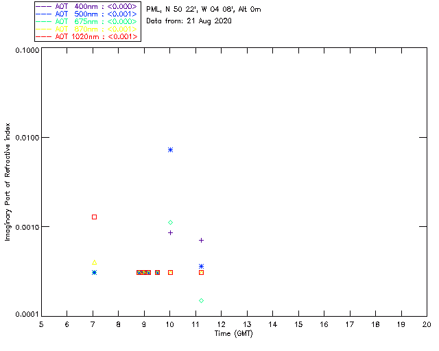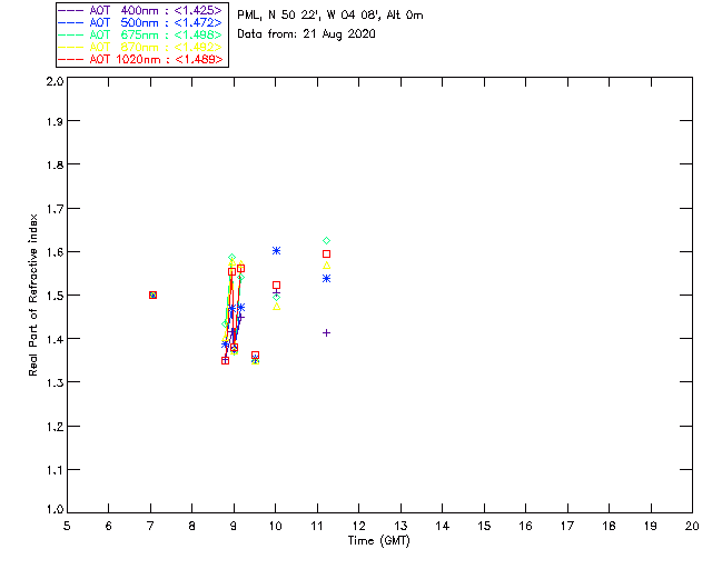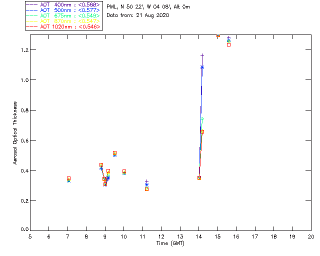 In May 2001 a PREDE POM01-L was installed on the roof of the Plymouth Marine Laboratory to continue the atmospheric correction research of the PML Remote Sensing Group. This was to replace the AERONET CIMEL sunphotometer situated at Rame Head which was decommissioned in 1999. The instrument operates at 7 wavelengths (315, 400, 500, 670, 870, 940 and 1020nm) and scans at pre-set angles away from the solar disk to determine, using the inversion code of Nakajima et al. (2006), various properties of tiny particles called aerosols within the atmospheric column. From these measurements useful atmospheric aerosol parameters such as the Aerosol Optical Thickness (AOT), aerosol size distribution and single scattering albedo can be calculated. Marine aerosols tend to be bigger (D > 1µm) than those generated over the land (0.01 < D < 1µm) and are of a different chemical composition; marine aerosols are salt particles whereas terrestrial aerosols are sulphate compounds.
