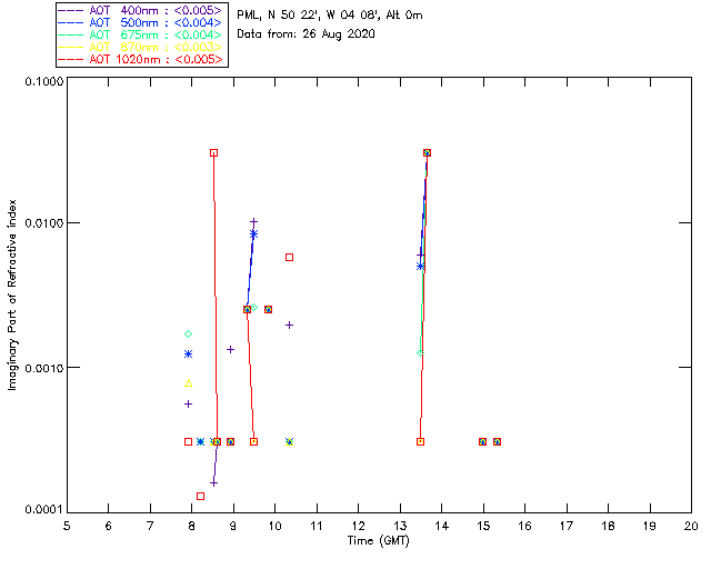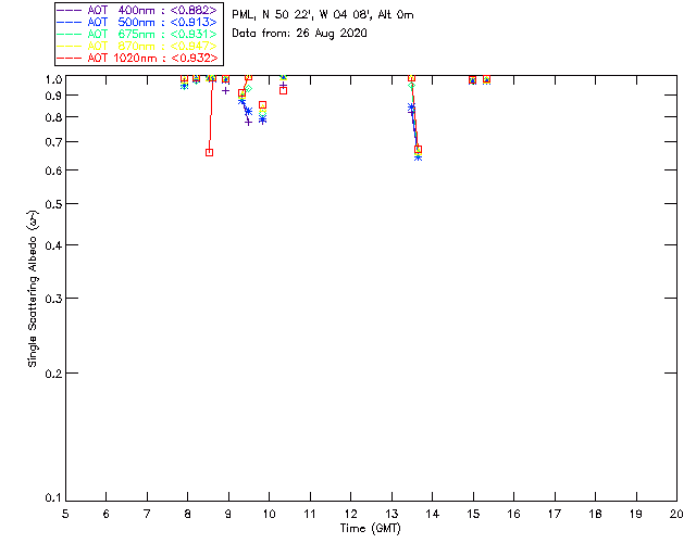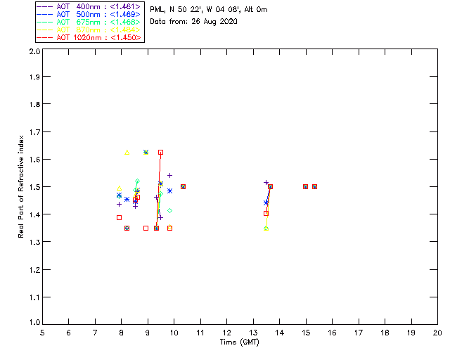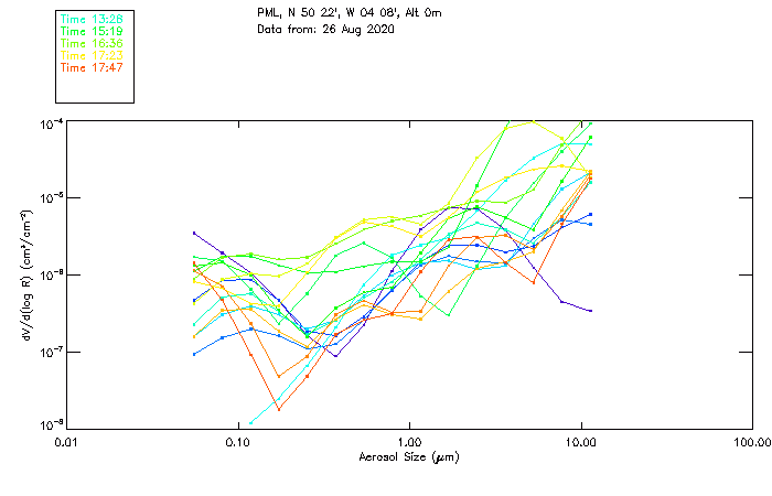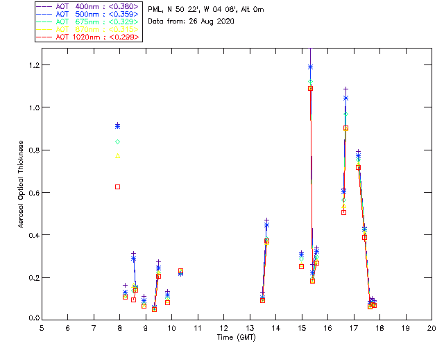 In May 2001 a PREDE POM01-L was installed on the roof of the Plymouth Marine Laboratory to continue the atmospheric correction research of the PML Remote Sensing Group. This was to replace the AERONET CIMEL sunphotometer situated at Rame Head which was decommissioned in 1999. The instrument operates at 7 wavelengths (315, 400, 500, 670, 870, 940 and 1020nm) and scans at pre-set angles away from the solar disk to determine, using the inversion code of Nakajima et al. (2006), various properties of tiny particles called aerosols within the atmospheric column. From these measurements useful atmospheric aerosol parameters such as the Aerosol Optical Thickness (AOT), aerosol size distribution and single scattering albedo can be calculated. Marine aerosols tend to be bigger (D > 1µm) than those generated over the land (0.01 < D < 1µm) and are of a different chemical composition; marine aerosols are salt particles whereas terrestrial aerosols are sulphate compounds.