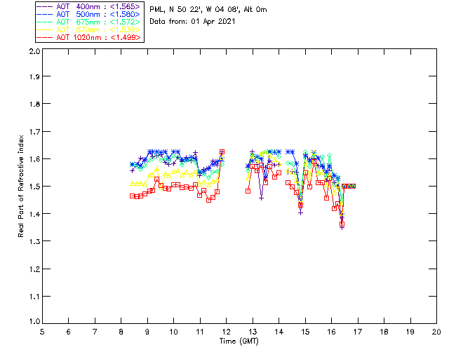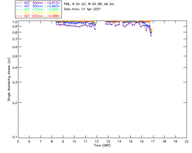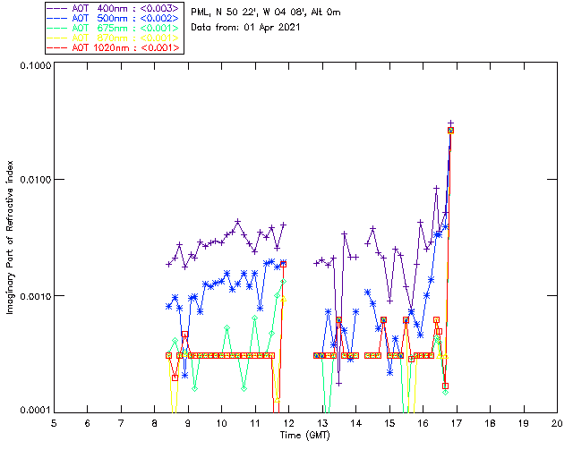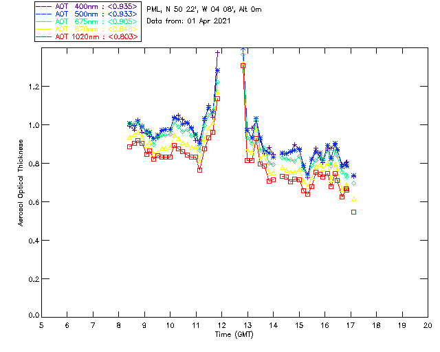 In May 2001 a PREDE POM01-L was installed on the roof of the Plymouth Marine Laboratory to continue the atmospheric correction research of the PML Remote Sensing Group. This was to replace the AERONET CIMEL sunphotometer situated at Rame Head which was decommissioned in 1999. The instrument operates at 7 wavelengths (315, 400, 500, 670, 870, 940 and 1020nm) and scans at pre-set angles away from the solar disk to determine, using the inversion code of Nakajima et al. (2006), various properties of tiny particles called aerosols within the atmospheric column. From these measurements useful atmospheric aerosol parameters such as the Aerosol Optical Thickness (AOT), aerosol size distribution and single scattering albedo can be calculated. Marine aerosols tend to be bigger (D > 1µm) than those generated over the land (0.01 < D < 1µm) and are of a different chemical composition; marine aerosols are salt particles whereas terrestrial aerosols are sulphate compounds.