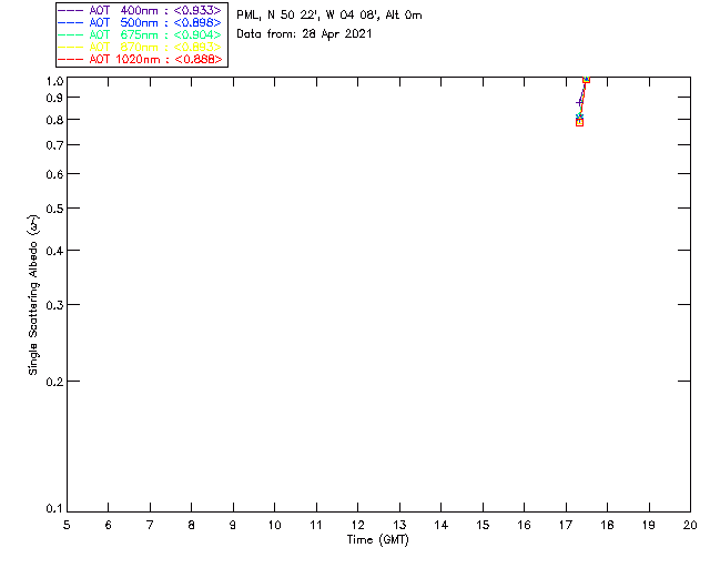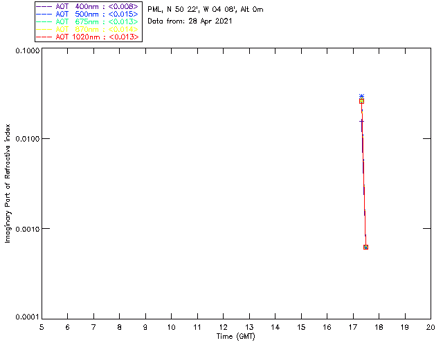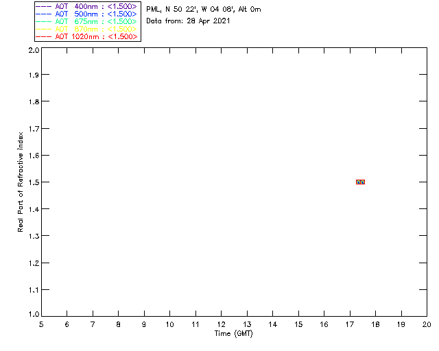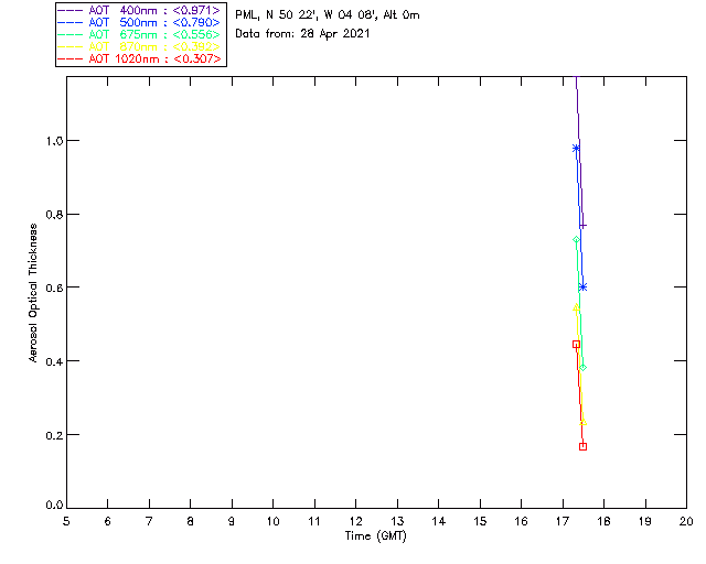 In May 2001 a PREDE POM01-L was installed on the roof of the Plymouth Marine Laboratory to continue the atmospheric correction research of the PML Remote Sensing Group. This was to replace the AERONET CIMEL sunphotometer situated at Rame Head which was decommissioned in 1999. The instrument operates at 7 wavelengths (315, 400, 500, 670, 870, 940 and 1020nm) and scans at pre-set angles away from the solar disk to determine, using the inversion code of Nakajima et al. (2006), various properties of tiny particles called aerosols within the atmospheric column. From these measurements useful atmospheric aerosol parameters such as the Aerosol Optical Thickness (AOT), aerosol size distribution and single scattering albedo can be calculated. Marine aerosols tend to be bigger (D > 1µm) than those generated over the land (0.01 < D < 1µm) and are of a different chemical composition; marine aerosols are salt particles whereas terrestrial aerosols are sulphate compounds.