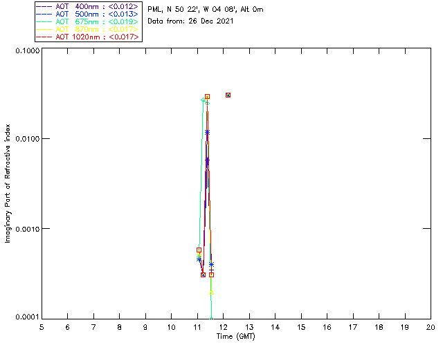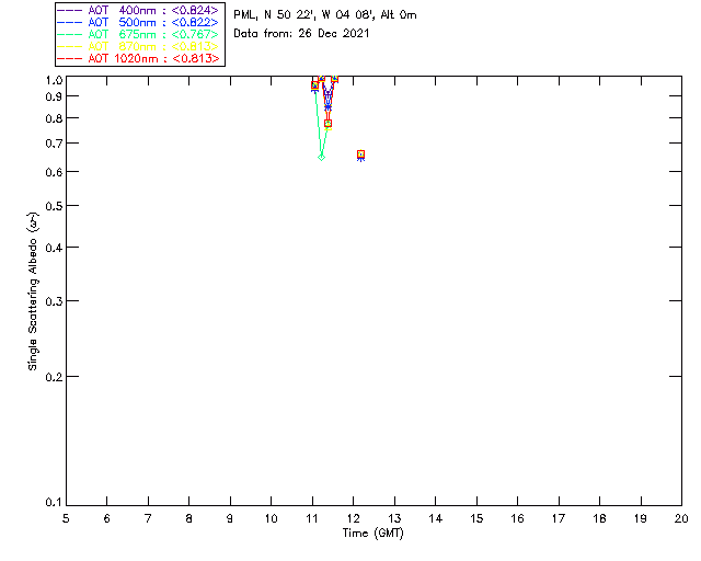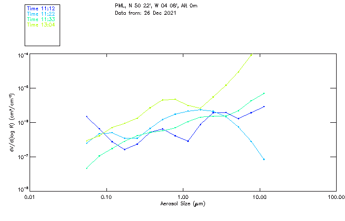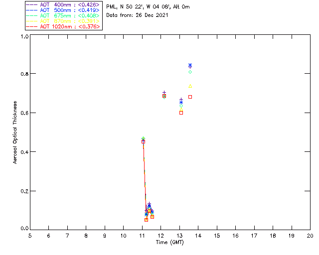 In May 2001 a PREDE POM01-L was installed on the roof of the Plymouth Marine Laboratory to continue the atmospheric correction research of the PML Remote Sensing Group. This was to replace the AERONET CIMEL sunphotometer situated at Rame Head which was decommissioned in 1999. The instrument operates at 7 wavelengths (315, 400, 500, 670, 870, 940 and 1020nm) and scans at pre-set angles away from the solar disk to determine, using the inversion code of Nakajima et al. (2006), various properties of tiny particles called aerosols within the atmospheric column. From these measurements useful atmospheric aerosol parameters such as the Aerosol Optical Thickness (AOT), aerosol size distribution and single scattering albedo can be calculated. Marine aerosols tend to be bigger (D > 1µm) than those generated over the land (0.01 < D < 1µm) and are of a different chemical composition; marine aerosols are salt particles whereas terrestrial aerosols are sulphate compounds.