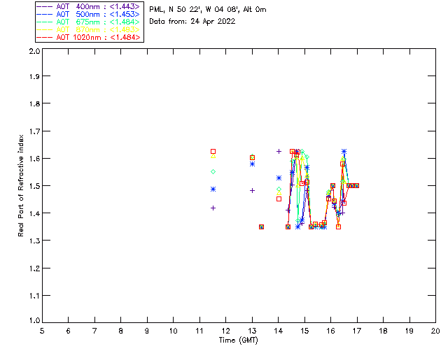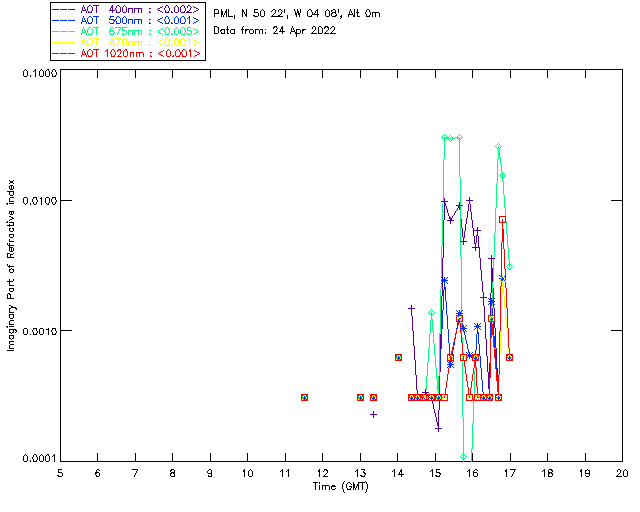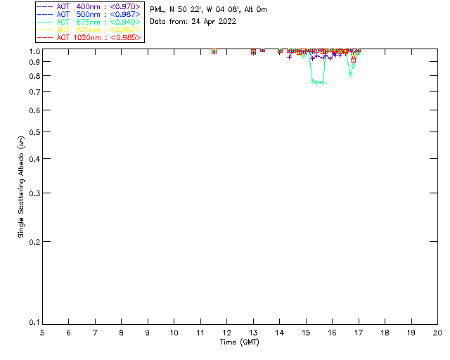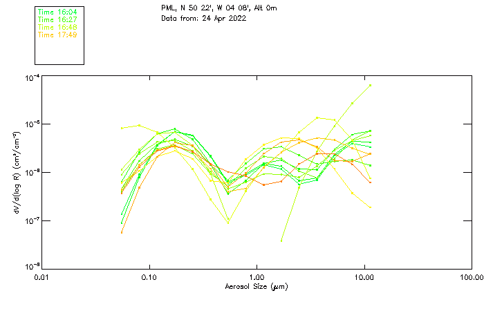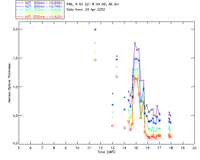 In May 2001 a PREDE POM01-L was installed on the roof of the Plymouth Marine Laboratory to continue the atmospheric correction research of the PML Remote Sensing Group. This was to replace the AERONET CIMEL sunphotometer situated at Rame Head which was decommissioned in 1999. The instrument operates at 7 wavelengths (315, 400, 500, 670, 870, 940 and 1020nm) and scans at pre-set angles away from the solar disk to determine, using the inversion code of Nakajima et al. (2006), various properties of tiny particles called aerosols within the atmospheric column. From these measurements useful atmospheric aerosol parameters such as the Aerosol Optical Thickness (AOT), aerosol size distribution and single scattering albedo can be calculated. Marine aerosols tend to be bigger (D > 1µm) than those generated over the land (0.01 < D < 1µm) and are of a different chemical composition; marine aerosols are salt particles whereas terrestrial aerosols are sulphate compounds.