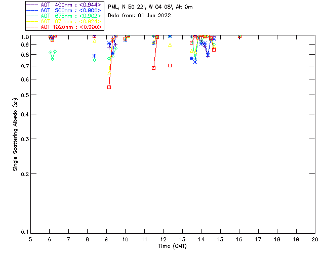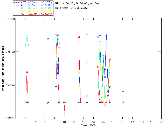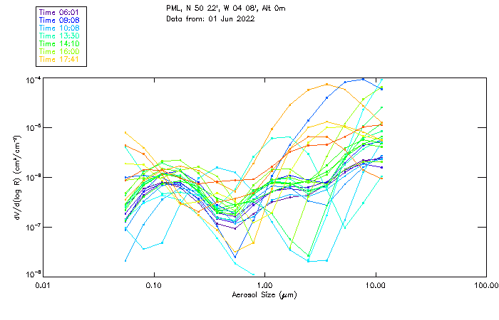 In May 2001 a PREDE POM01-L was installed on the roof of the Plymouth Marine Laboratory to continue the atmospheric correction research of the PML Remote Sensing Group. This was to replace the AERONET CIMEL sunphotometer situated at Rame Head which was decommissioned in 1999. The instrument operates at 7 wavelengths (315, 400, 500, 670, 870, 940 and 1020nm) and scans at pre-set angles away from the solar disk to determine, using the inversion code of Nakajima et al. (2006), various properties of tiny particles called aerosols within the atmospheric column. From these measurements useful atmospheric aerosol parameters such as the Aerosol Optical Thickness (AOT), aerosol size distribution and single scattering albedo can be calculated. Marine aerosols tend to be bigger (D > 1µm) than those generated over the land (0.01 < D < 1µm) and are of a different chemical composition; marine aerosols are salt particles whereas terrestrial aerosols are sulphate compounds.