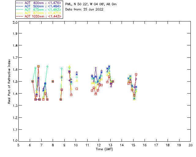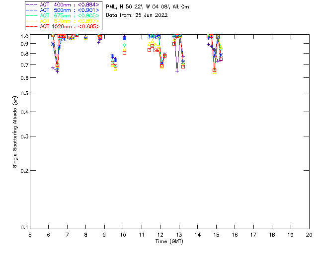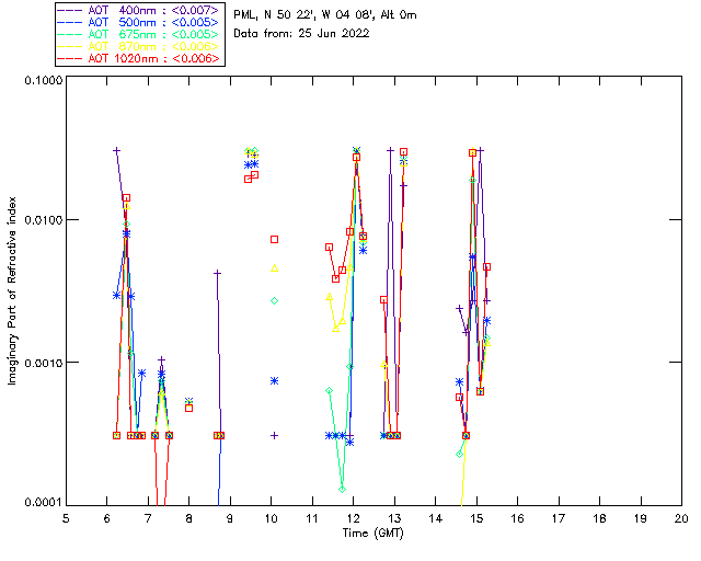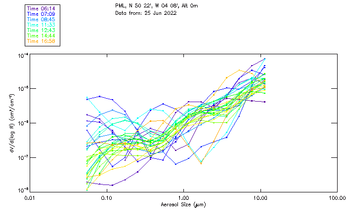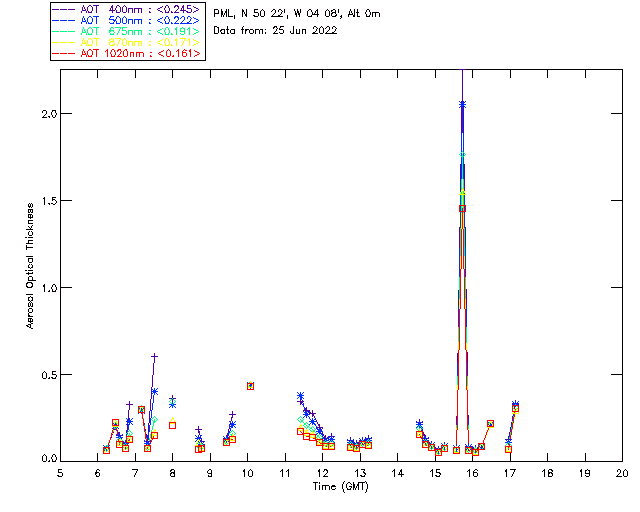 In May 2001 a PREDE POM01-L was installed on the roof of the Plymouth Marine Laboratory to continue the atmospheric correction research of the PML Remote Sensing Group. This was to replace the AERONET CIMEL sunphotometer situated at Rame Head which was decommissioned in 1999. The instrument operates at 7 wavelengths (315, 400, 500, 670, 870, 940 and 1020nm) and scans at pre-set angles away from the solar disk to determine, using the inversion code of Nakajima et al. (2006), various properties of tiny particles called aerosols within the atmospheric column. From these measurements useful atmospheric aerosol parameters such as the Aerosol Optical Thickness (AOT), aerosol size distribution and single scattering albedo can be calculated. Marine aerosols tend to be bigger (D > 1µm) than those generated over the land (0.01 < D < 1µm) and are of a different chemical composition; marine aerosols are salt particles whereas terrestrial aerosols are sulphate compounds.
