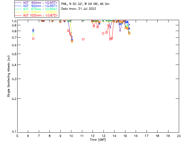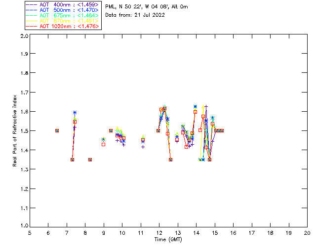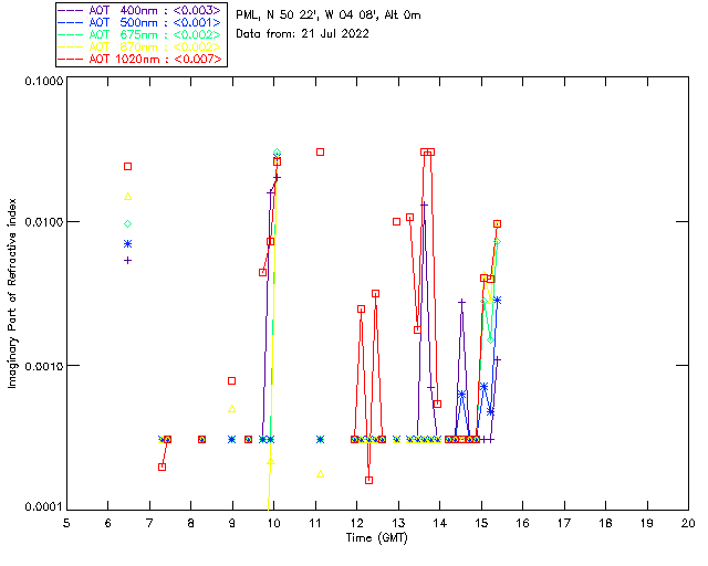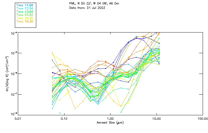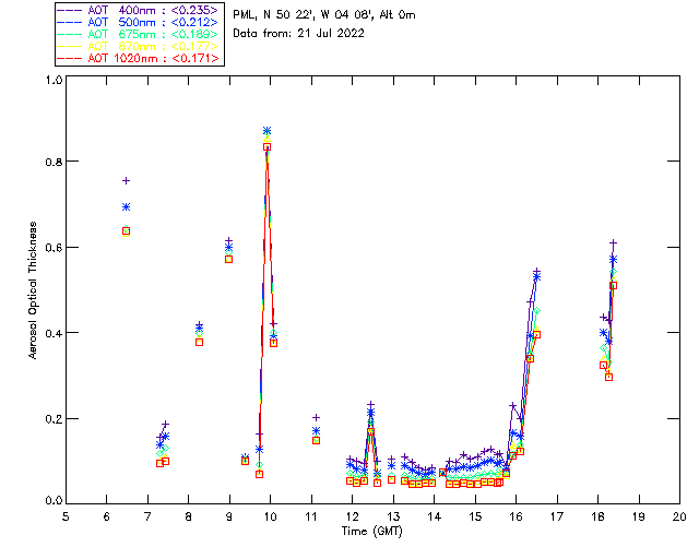 In May 2001 a PREDE POM01-L was installed on the roof of the Plymouth Marine Laboratory to continue the atmospheric correction research of the PML Remote Sensing Group. This was to replace the AERONET CIMEL sunphotometer situated at Rame Head which was decommissioned in 1999. The instrument operates at 7 wavelengths (315, 400, 500, 670, 870, 940 and 1020nm) and scans at pre-set angles away from the solar disk to determine, using the inversion code of Nakajima et al. (2006), various properties of tiny particles called aerosols within the atmospheric column. From these measurements useful atmospheric aerosol parameters such as the Aerosol Optical Thickness (AOT), aerosol size distribution and single scattering albedo can be calculated. Marine aerosols tend to be bigger (D > 1µm) than those generated over the land (0.01 < D < 1µm) and are of a different chemical composition; marine aerosols are salt particles whereas terrestrial aerosols are sulphate compounds.