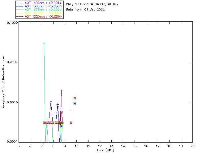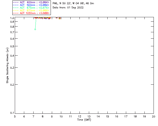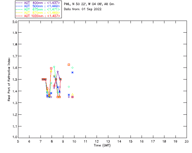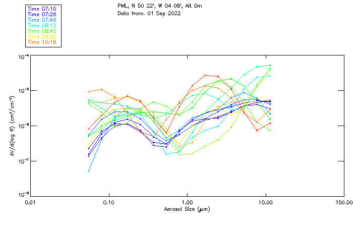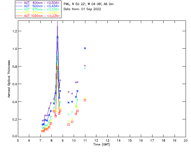 In May 2001 a PREDE POM01-L was installed on the roof of the Plymouth Marine Laboratory to continue the atmospheric correction research of the PML Remote Sensing Group. This was to replace the AERONET CIMEL sunphotometer situated at Rame Head which was decommissioned in 1999. The instrument operates at 7 wavelengths (315, 400, 500, 670, 870, 940 and 1020nm) and scans at pre-set angles away from the solar disk to determine, using the inversion code of Nakajima et al. (2006), various properties of tiny particles called aerosols within the atmospheric column. From these measurements useful atmospheric aerosol parameters such as the Aerosol Optical Thickness (AOT), aerosol size distribution and single scattering albedo can be calculated. Marine aerosols tend to be bigger (D > 1µm) than those generated over the land (0.01 < D < 1µm) and are of a different chemical composition; marine aerosols are salt particles whereas terrestrial aerosols are sulphate compounds.