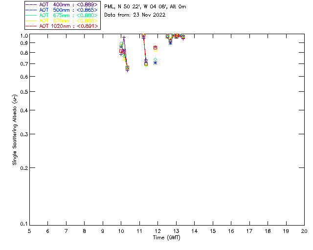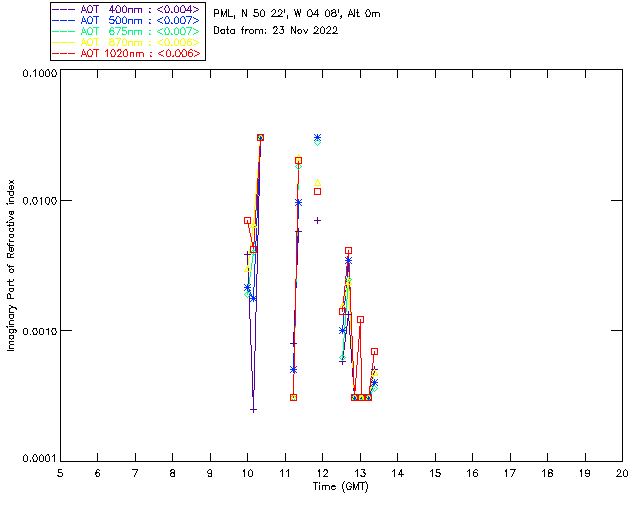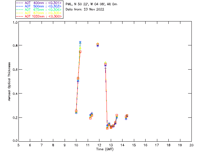 In May 2001 a PREDE POM01-L was installed on the roof of the Plymouth Marine Laboratory to continue the atmospheric correction research of the PML Remote Sensing Group. This was to replace the AERONET CIMEL sunphotometer situated at Rame Head which was decommissioned in 1999. The instrument operates at 7 wavelengths (315, 400, 500, 670, 870, 940 and 1020nm) and scans at pre-set angles away from the solar disk to determine, using the inversion code of Nakajima et al. (2006), various properties of tiny particles called aerosols within the atmospheric column. From these measurements useful atmospheric aerosol parameters such as the Aerosol Optical Thickness (AOT), aerosol size distribution and single scattering albedo can be calculated. Marine aerosols tend to be bigger (D > 1µm) than those generated over the land (0.01 < D < 1µm) and are of a different chemical composition; marine aerosols are salt particles whereas terrestrial aerosols are sulphate compounds.