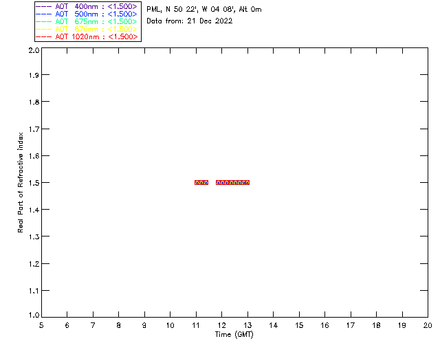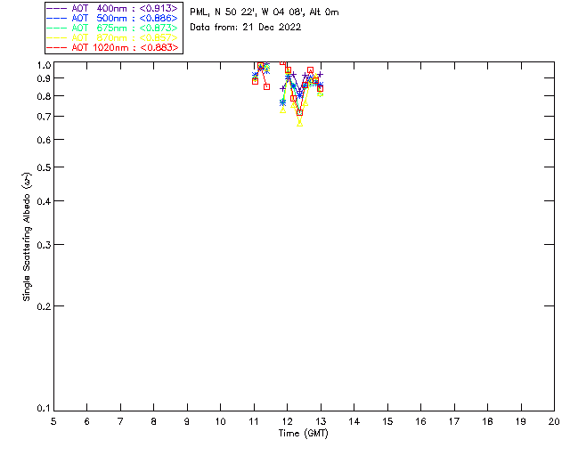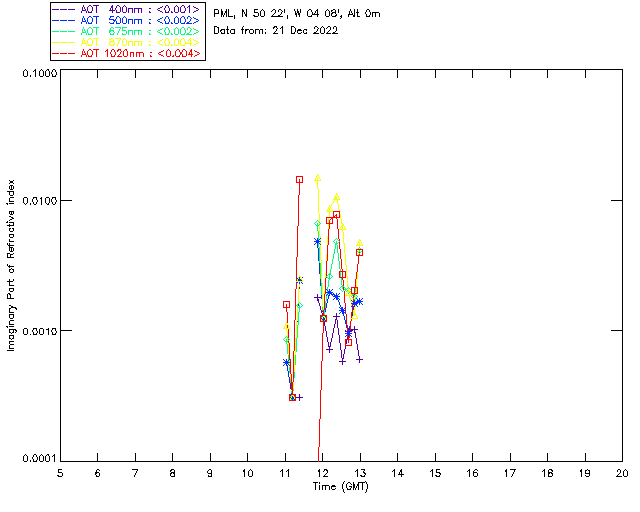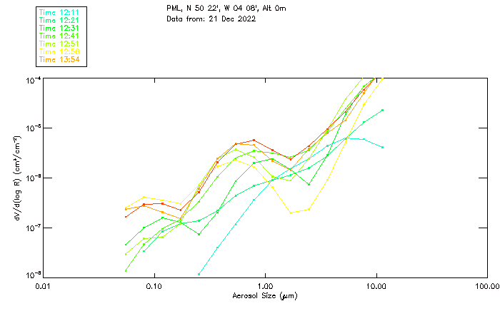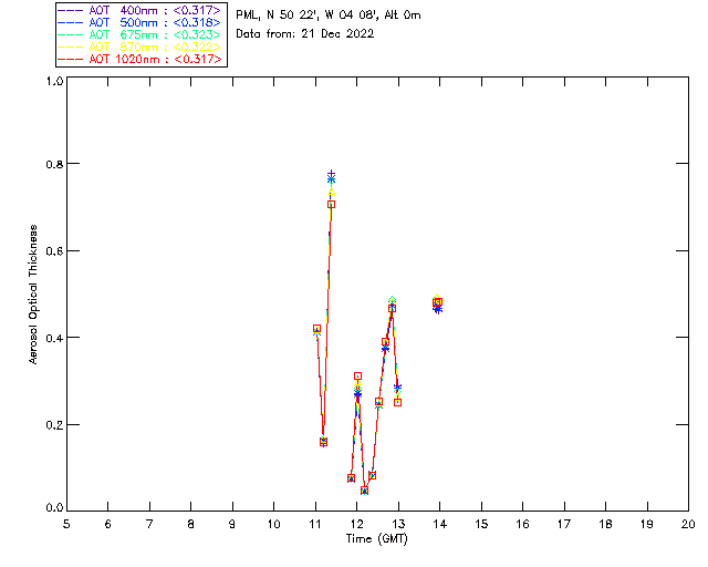 In May 2001 a PREDE POM01-L was installed on the roof of the Plymouth Marine Laboratory to continue the atmospheric correction research of the PML Remote Sensing Group. This was to replace the AERONET CIMEL sunphotometer situated at Rame Head which was decommissioned in 1999. The instrument operates at 7 wavelengths (315, 400, 500, 670, 870, 940 and 1020nm) and scans at pre-set angles away from the solar disk to determine, using the inversion code of Nakajima et al. (2006), various properties of tiny particles called aerosols within the atmospheric column. From these measurements useful atmospheric aerosol parameters such as the Aerosol Optical Thickness (AOT), aerosol size distribution and single scattering albedo can be calculated. Marine aerosols tend to be bigger (D > 1µm) than those generated over the land (0.01 < D < 1µm) and are of a different chemical composition; marine aerosols are salt particles whereas terrestrial aerosols are sulphate compounds.