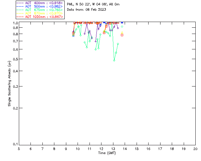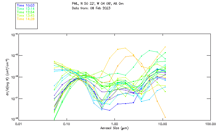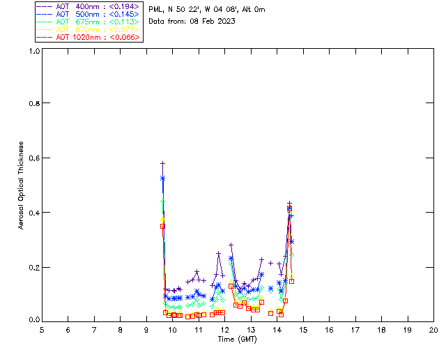 In May 2001 a PREDE POM01-L was installed on the roof of the Plymouth Marine Laboratory to continue the atmospheric correction research of the PML Remote Sensing Group. This was to replace the AERONET CIMEL sunphotometer situated at Rame Head which was decommissioned in 1999. The instrument operates at 7 wavelengths (315, 400, 500, 670, 870, 940 and 1020nm) and scans at pre-set angles away from the solar disk to determine, using the inversion code of Nakajima et al. (2006), various properties of tiny particles called aerosols within the atmospheric column. From these measurements useful atmospheric aerosol parameters such as the Aerosol Optical Thickness (AOT), aerosol size distribution and single scattering albedo can be calculated. Marine aerosols tend to be bigger (D > 1µm) than those generated over the land (0.01 < D < 1µm) and are of a different chemical composition; marine aerosols are salt particles whereas terrestrial aerosols are sulphate compounds.